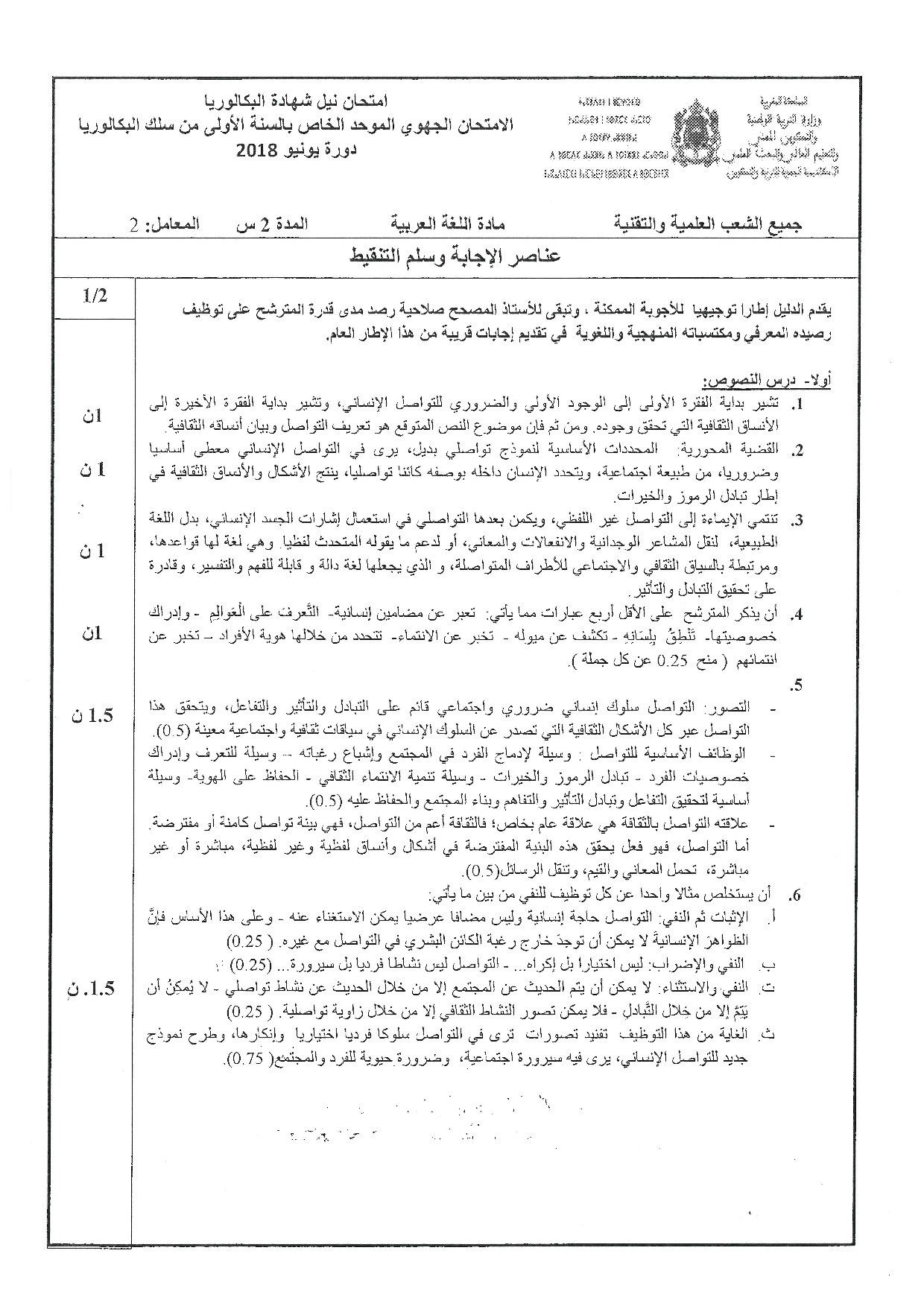 الامتحان الجهوي في اللغة العربية (د. العادية) - طنجة تطوان الحسيمة 2018 - التصحيح