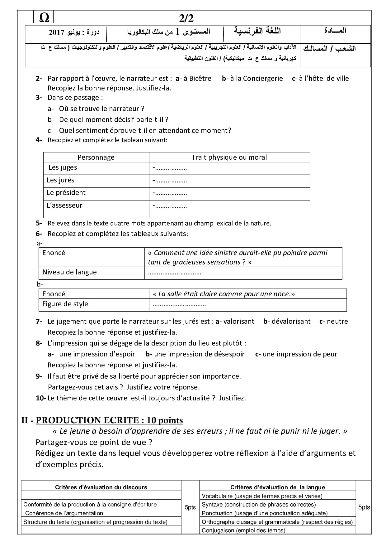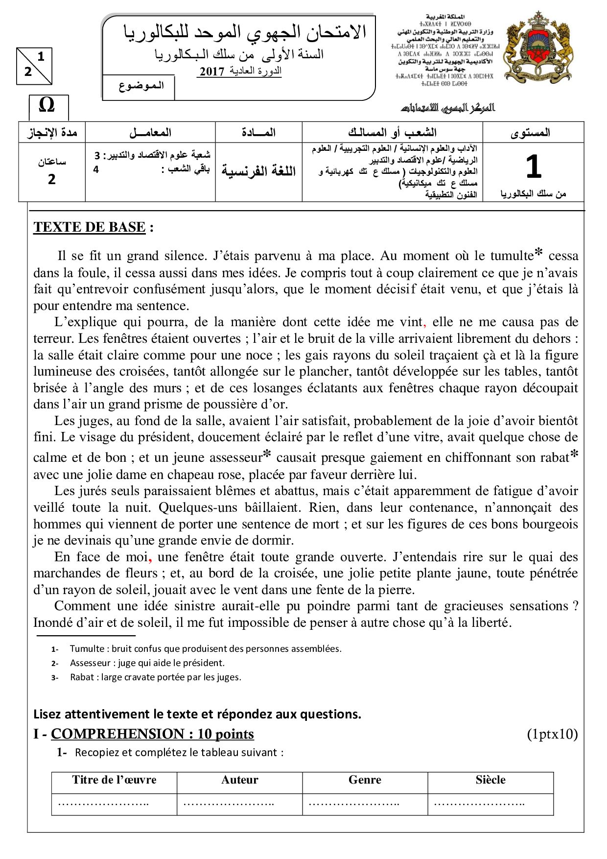 Examen régional Français (Session Normale) - Souss Massa 2017 - Sujet