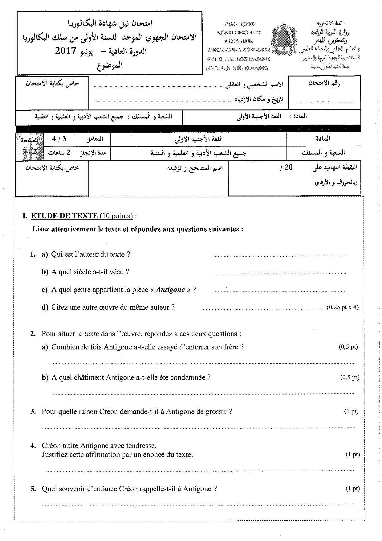 Examen régional Français (Session Normale) - Tanger-Tétouan-Al Hoceïma 2017 - Sujet