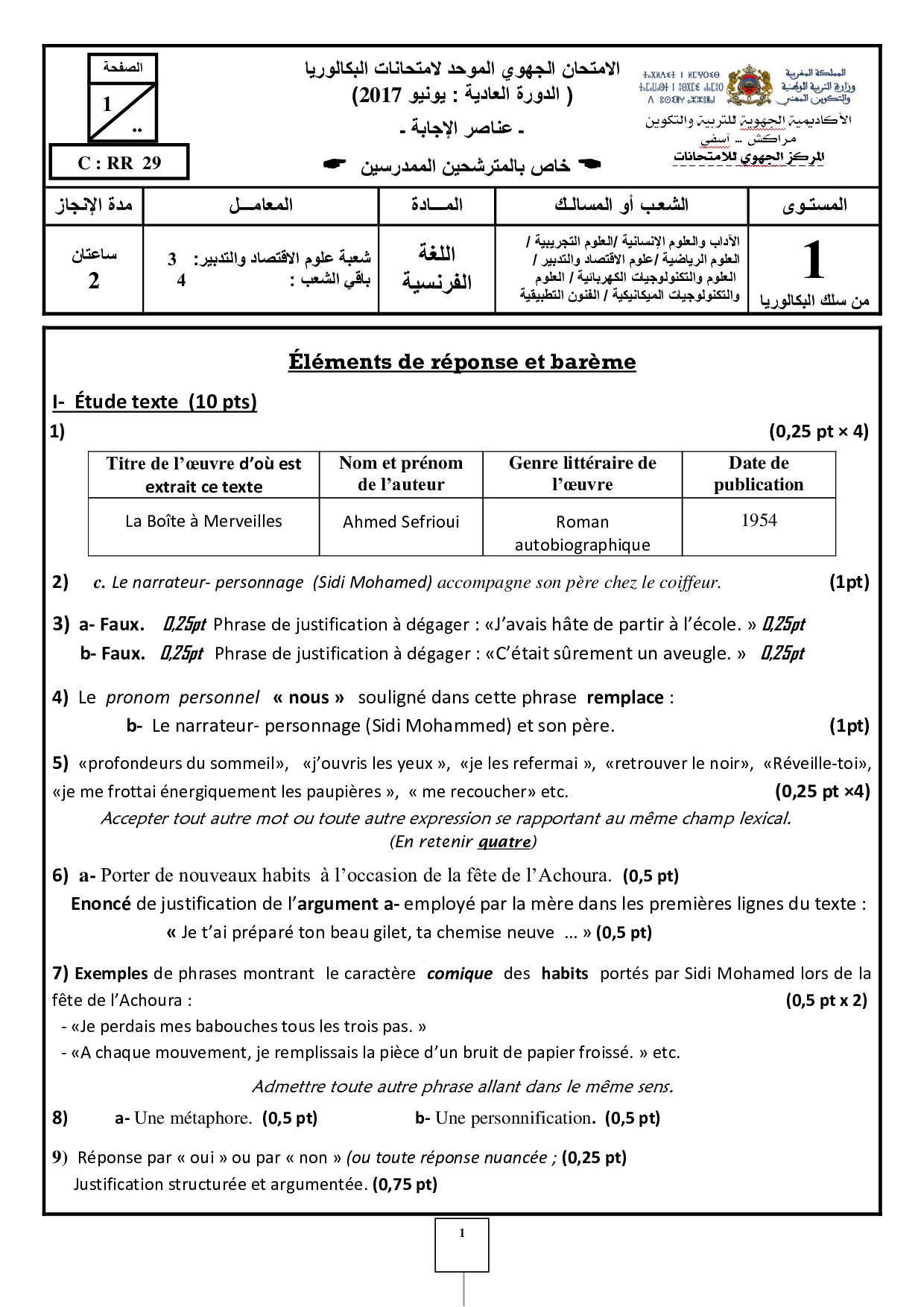 Examen régional Français (Session Normale) - Marrakech-Safi 2017 - Corrigé