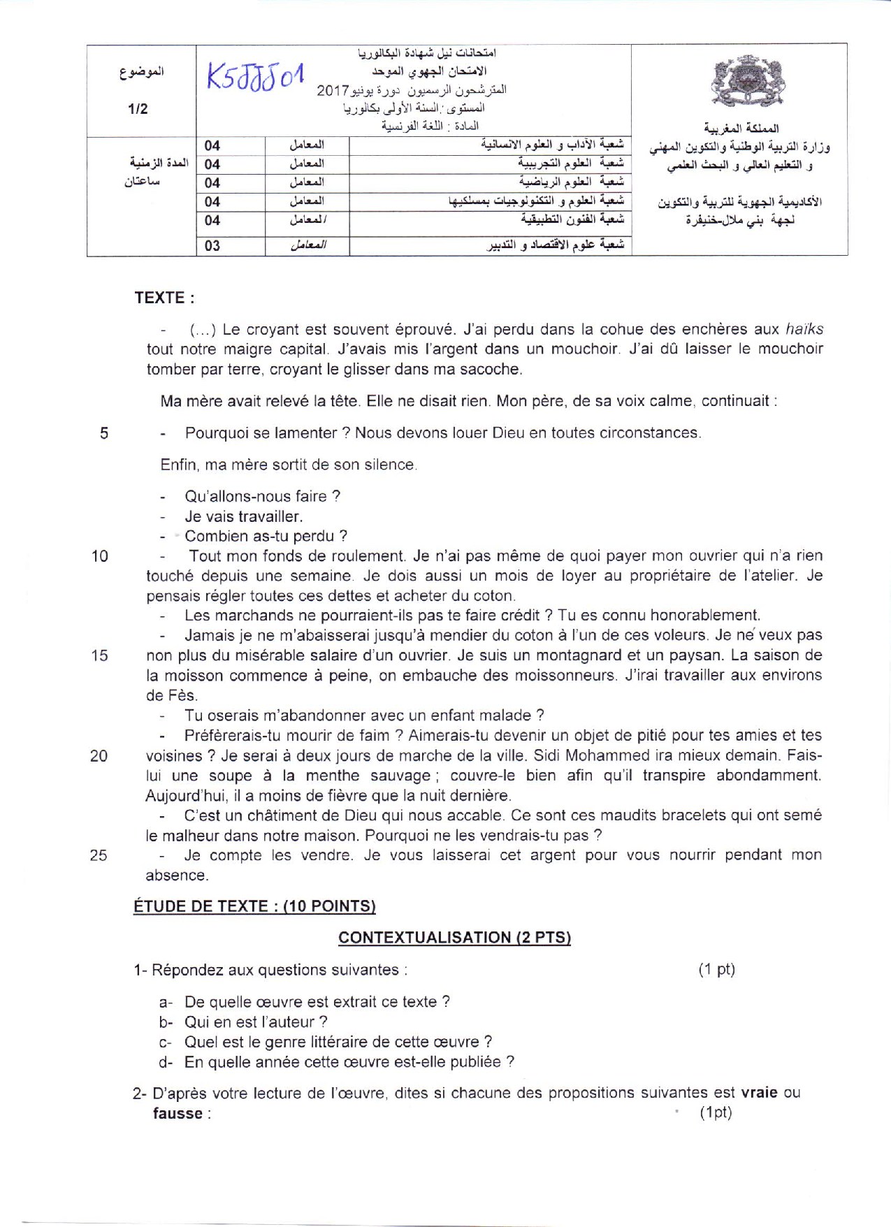 Examen régional Français (Session Normale) - Béni Mellal-Khénifra 2017 - Sujet
