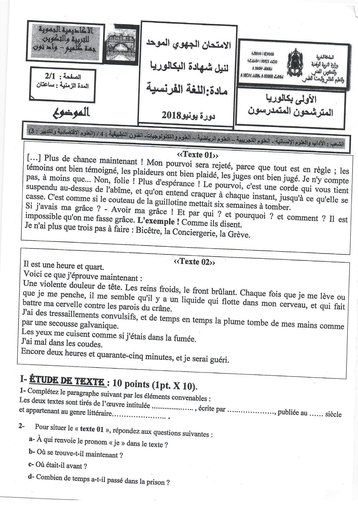 Examen régional Français (Session Normale) - Guelmim-Oued Noun 2018 - Sujet
