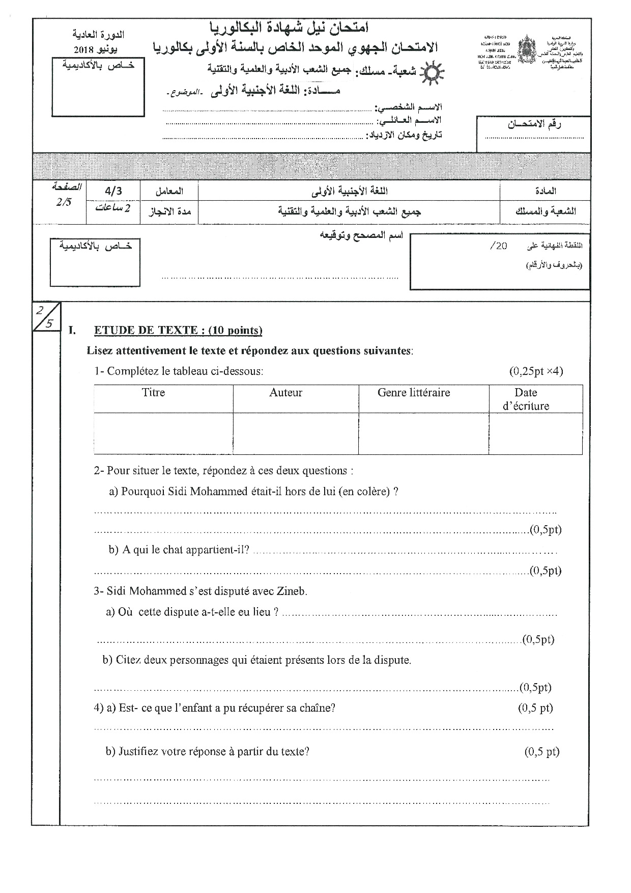 Examen régional Français (Session Normale) - Tanger-Tétouan-Al Hoceïma 2018 - Sujet