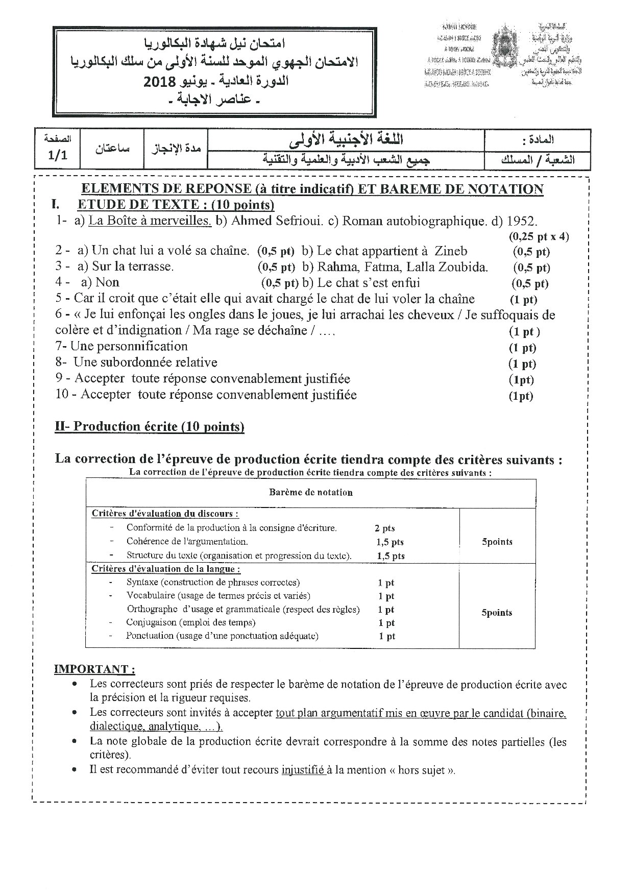 Examen régional Français (Session Normale) - Tanger-Tétouan-Al Hoceïma 2018 - Corrigé