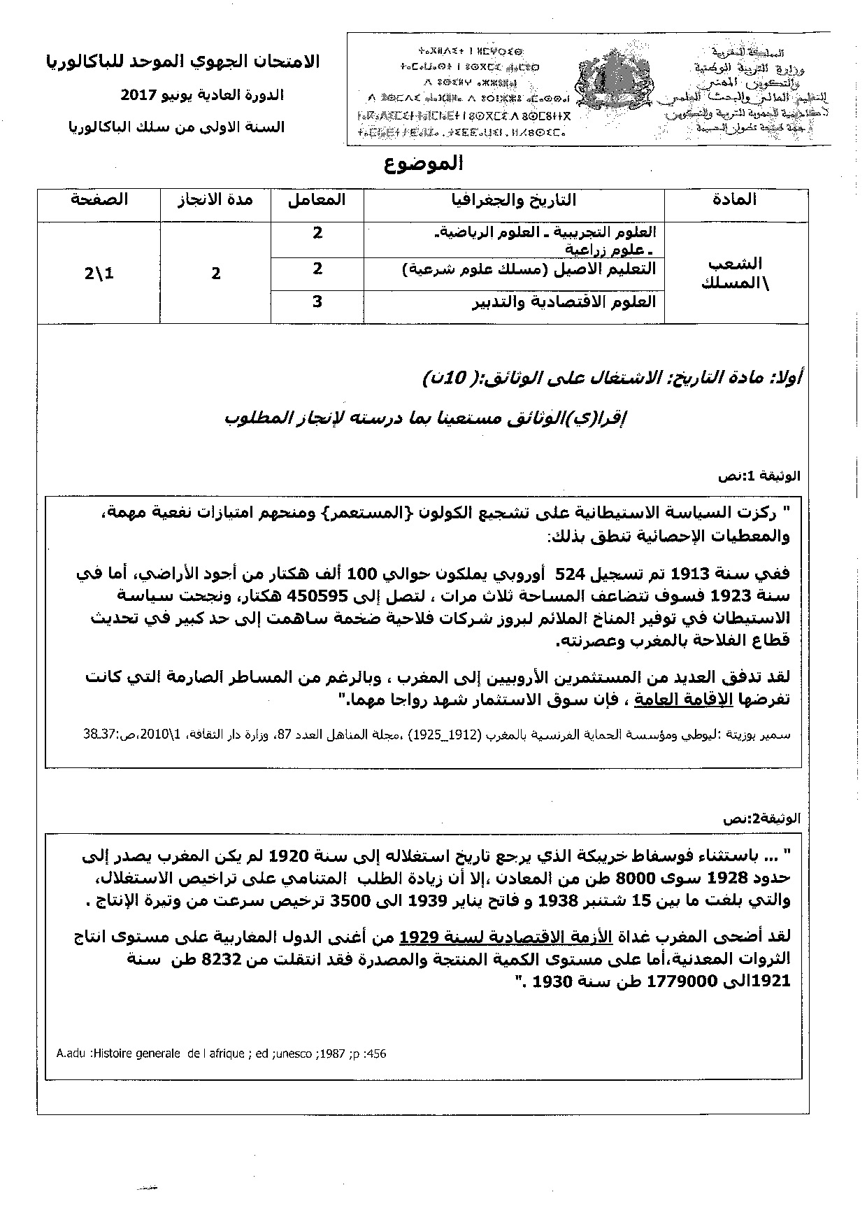 الامتحان الجهوي في التاريخ والجغرافية (د. العادية) - طنجة تطوان الحسيمة 2017 - الموضوع