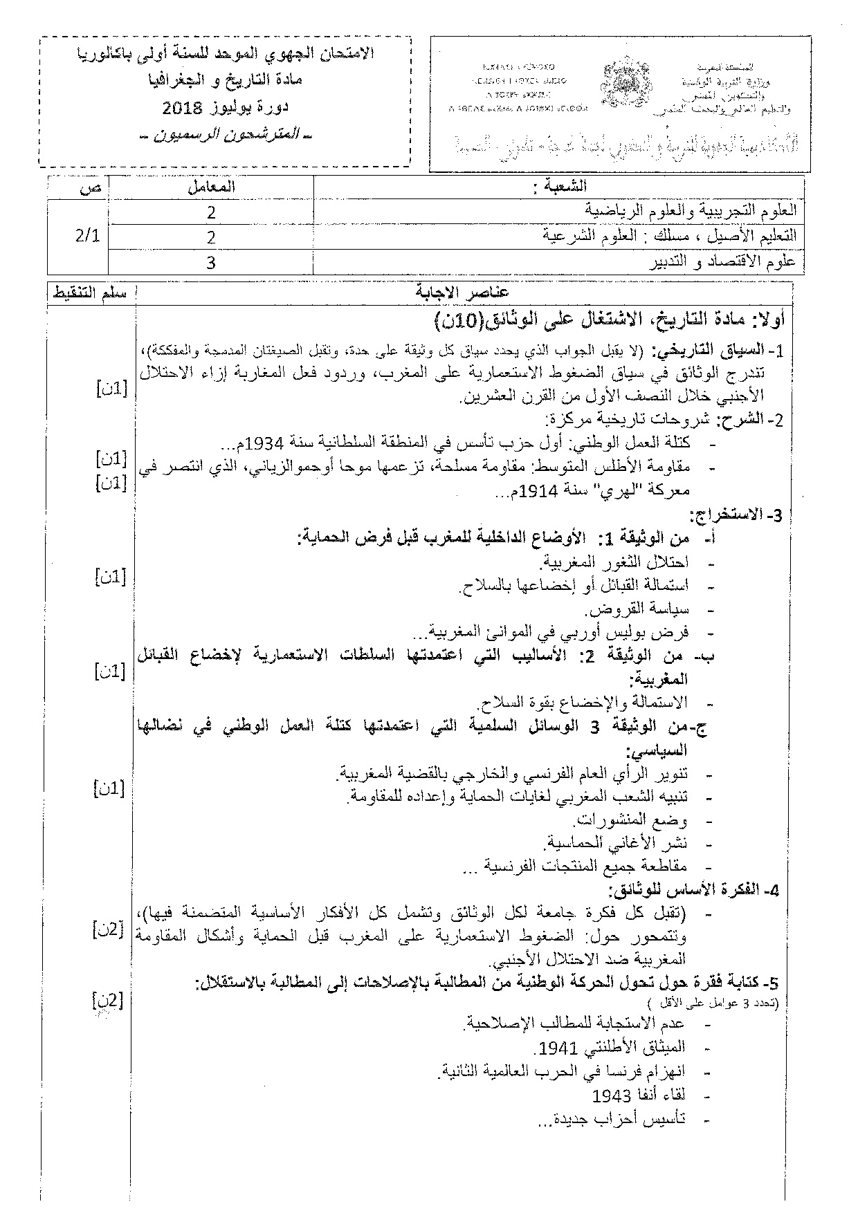 الامتحان الجهوي في التاريخ والجغرافية (د. الإستدراكية) - طنجة تطوان الحسيمة 2018 - التصحيح