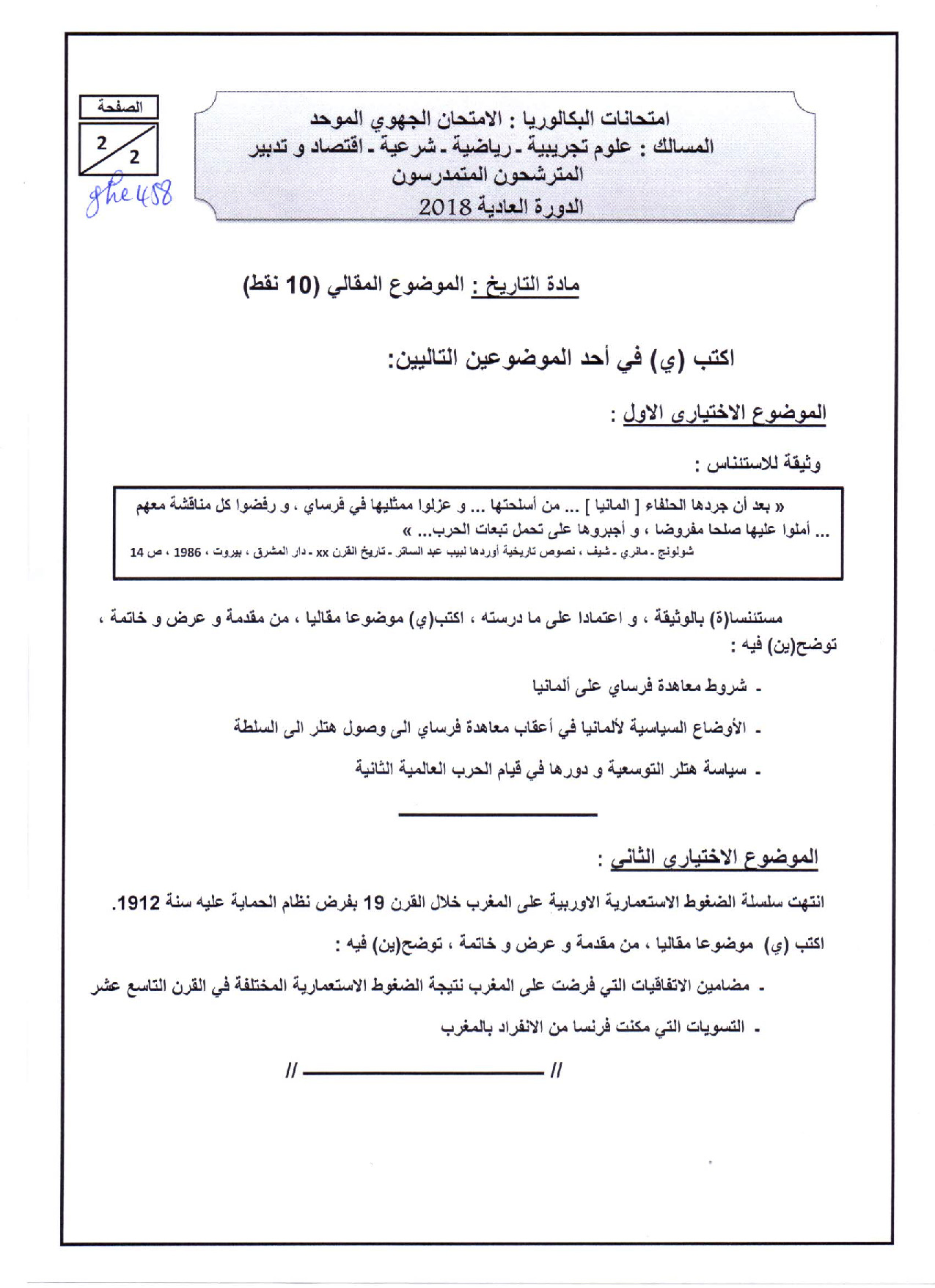 الامتحان الجهوي في التاريخ والجغرافية (د. العادية) - بني ملال خنيفرة 2018 - الموضوع