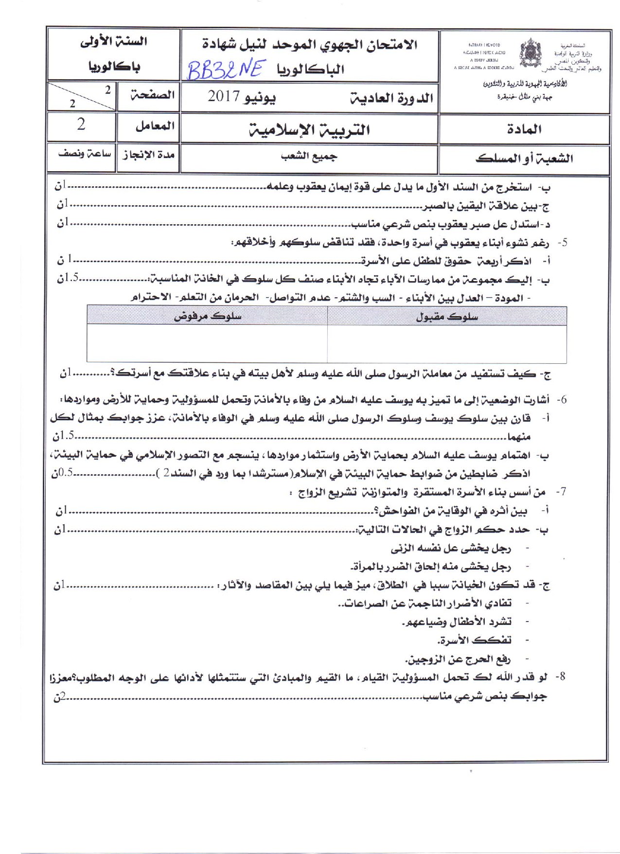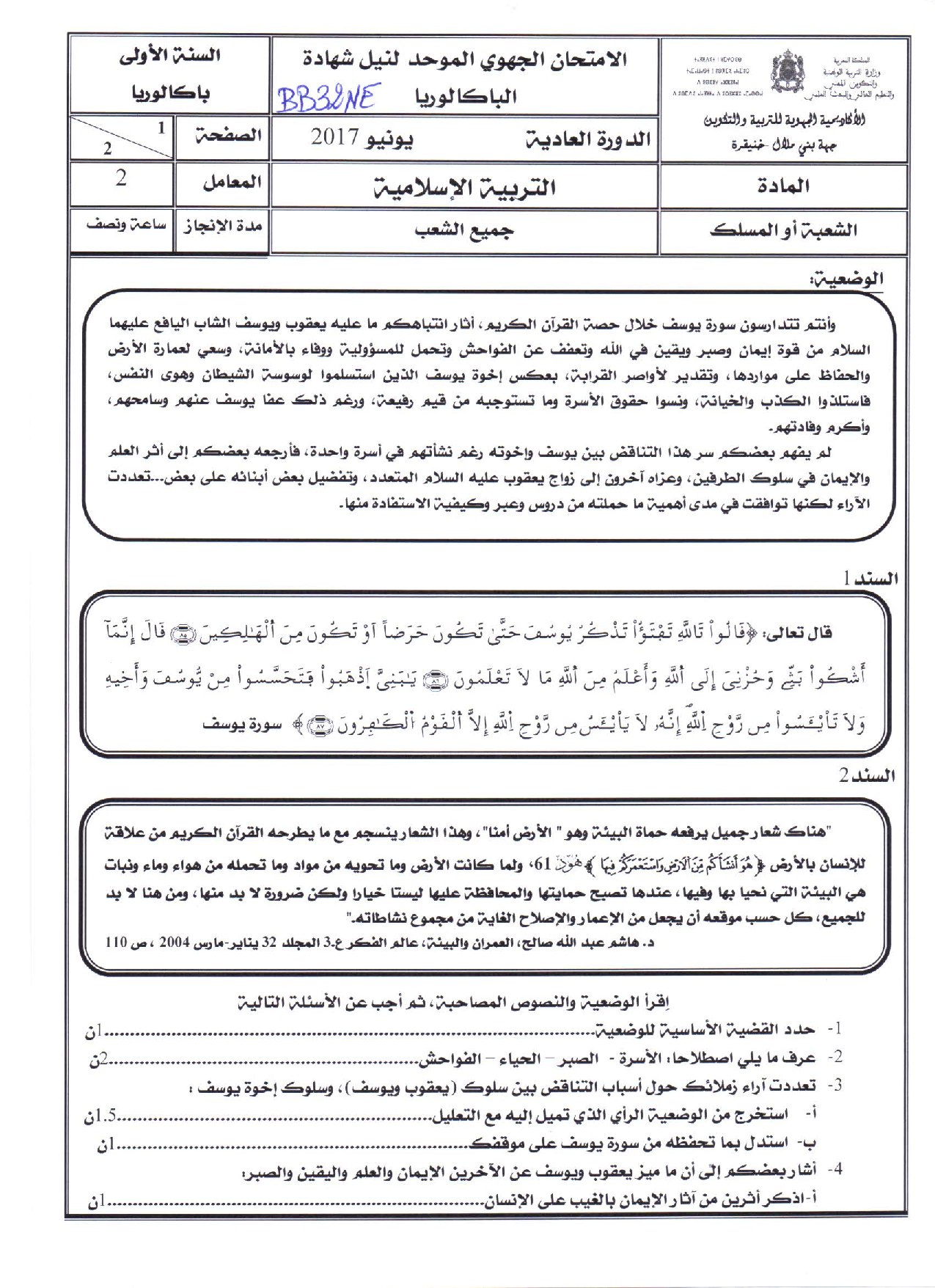 الامتحان الجهوي في التربية الإسلامية (د. العادية) - بني ملال خنيفرة 2017 - الموضوع