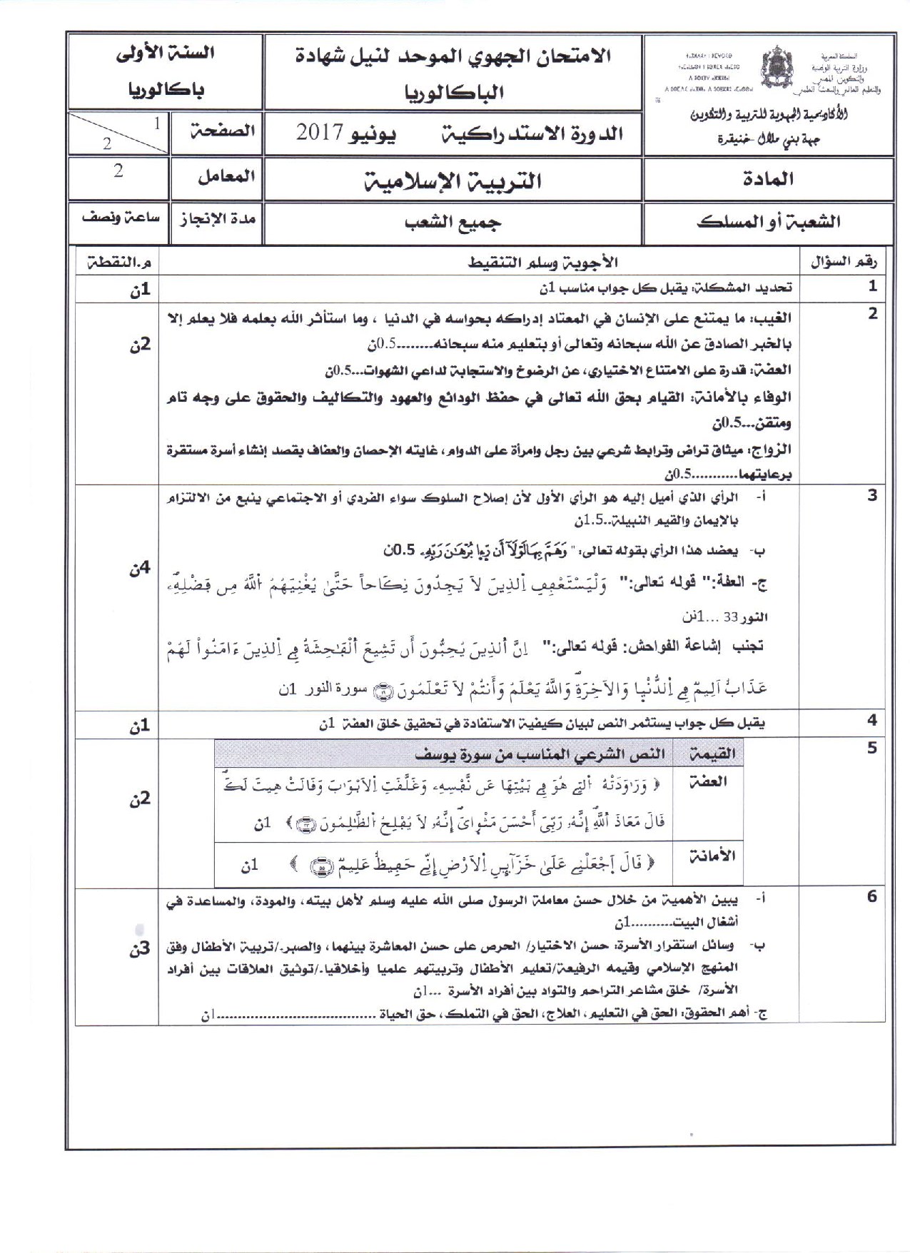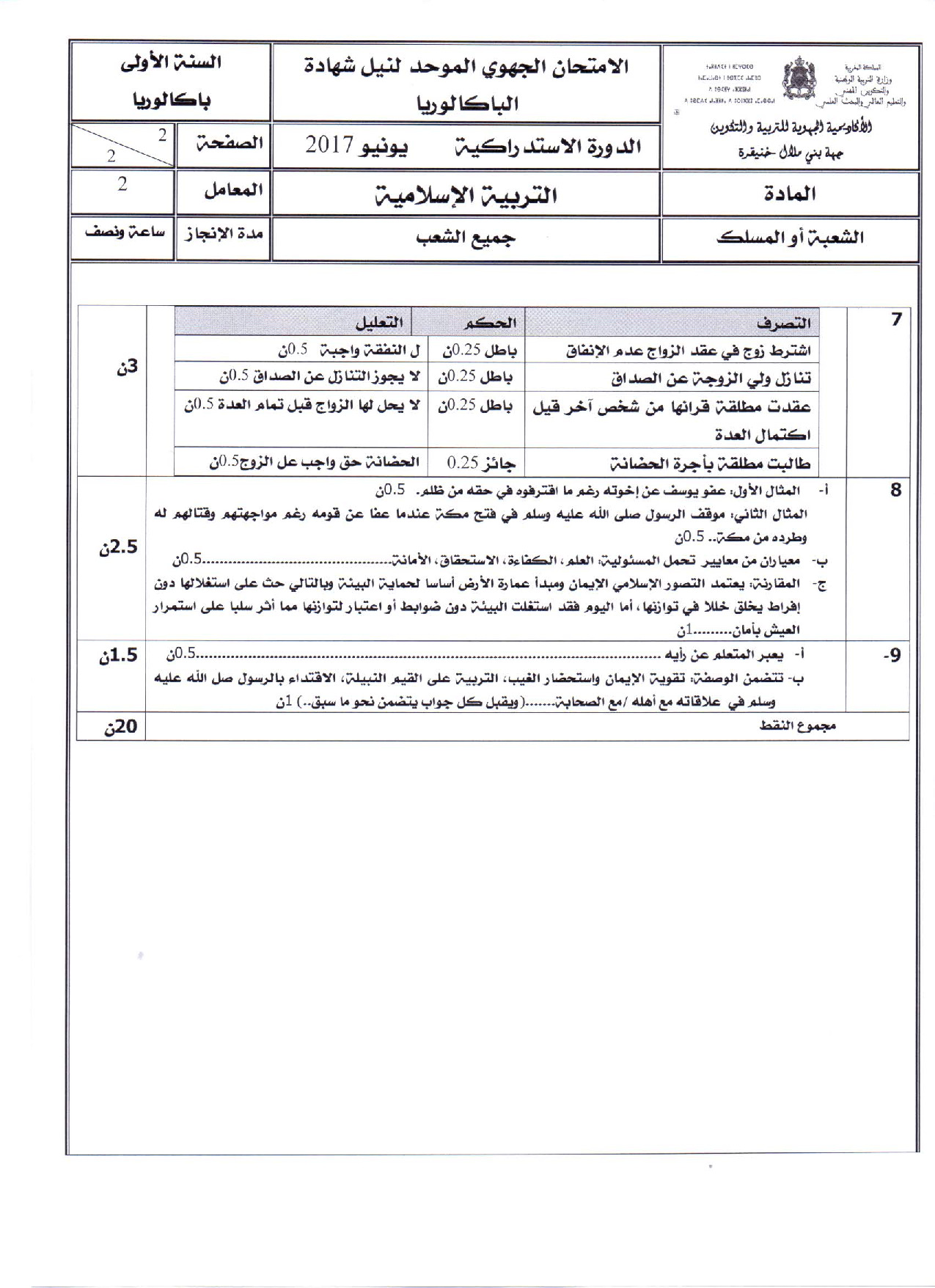 الامتحان الجهوي في التربية الإسلامية (د. الإستدراكية) - بني ملال خنيفرة 2017 - التصحيح