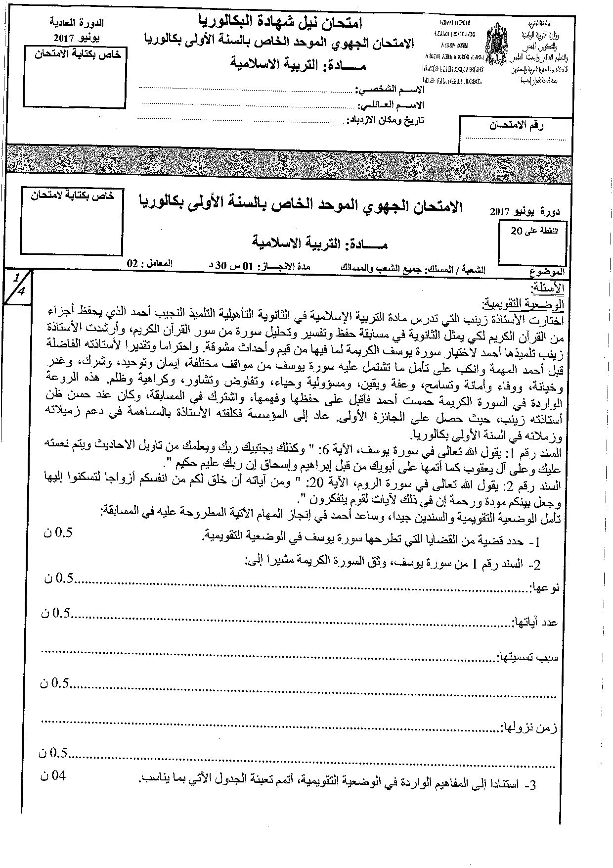 الامتحان الجهوي في التربية الإسلامية (د. العادية) - طنجة تطوان الحسيمة 2017 - الموضوع
