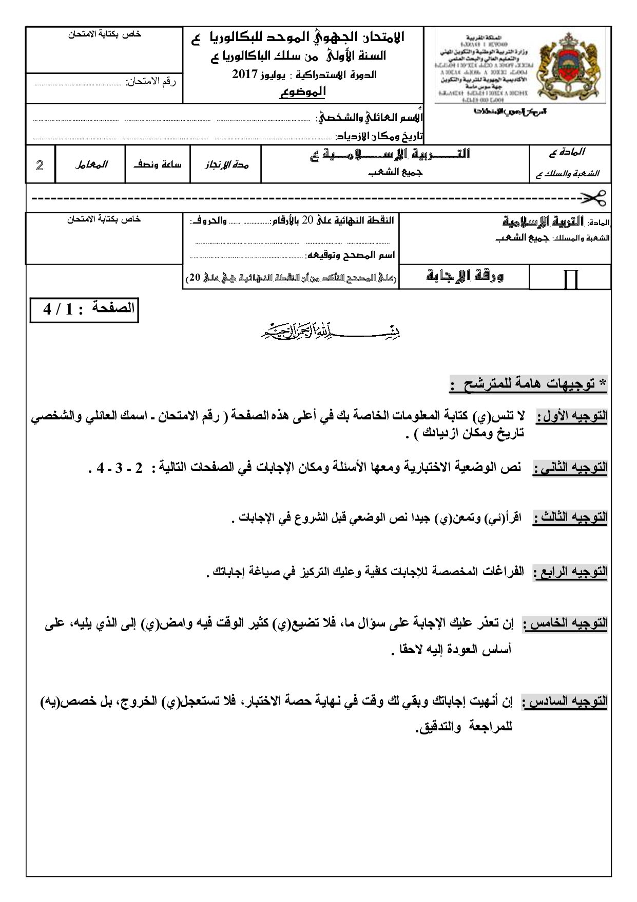 الامتحان الجهوي في التربية الإسلامية (د. الإستدراكية) - سوس ماسة 2017 - الموضوع