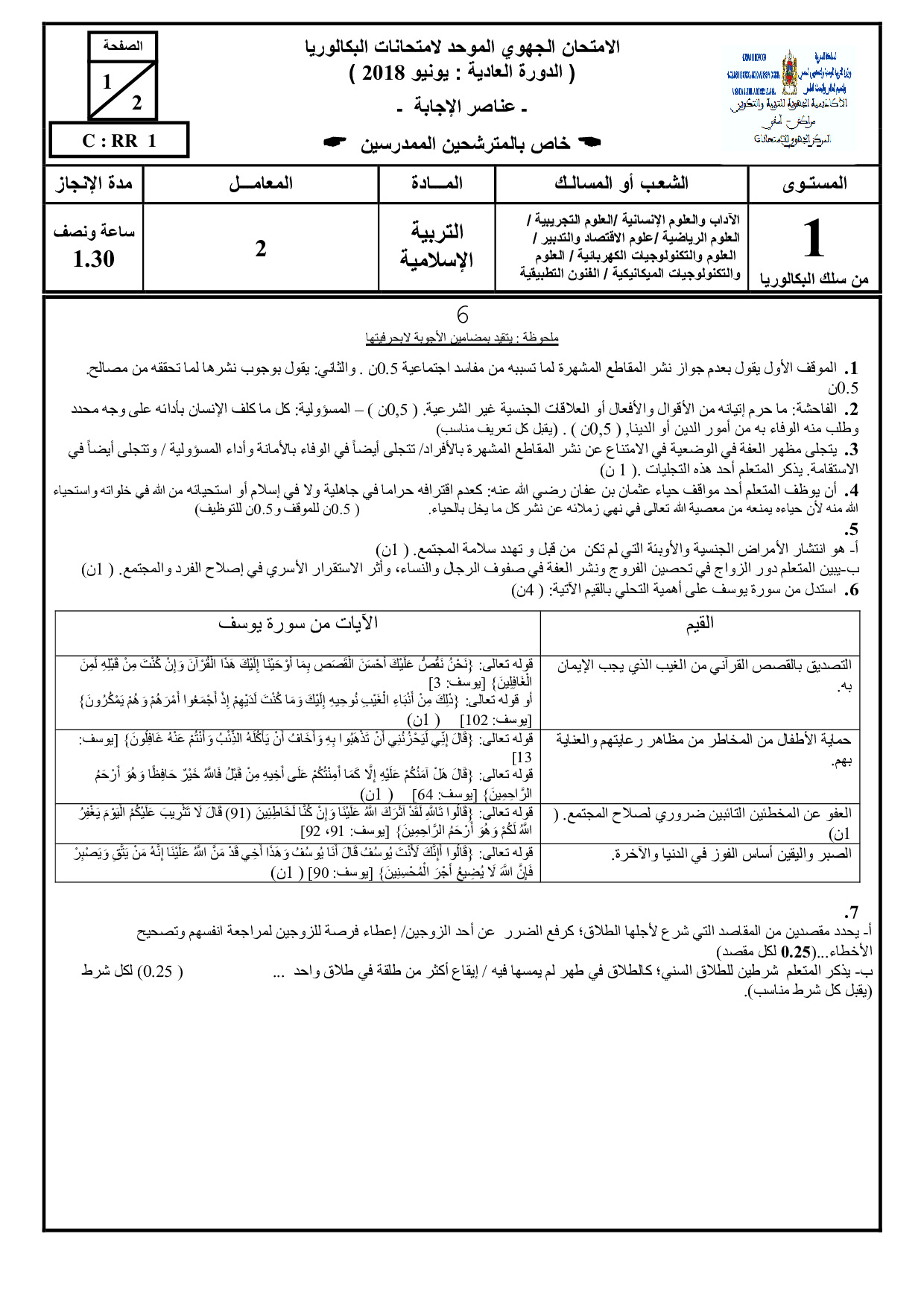 الامتحان الجهوي في التربية الإسلامية (د. العادية) - مراكش آسفي 2018 - التصحيح
