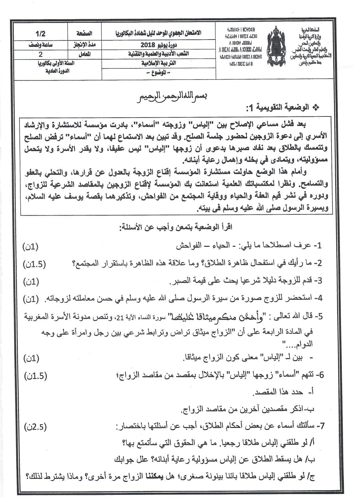 الامتحان الجهوي في التربية الإسلامية (د. العادية) - كلميم واد نون 2018 - الموضوع