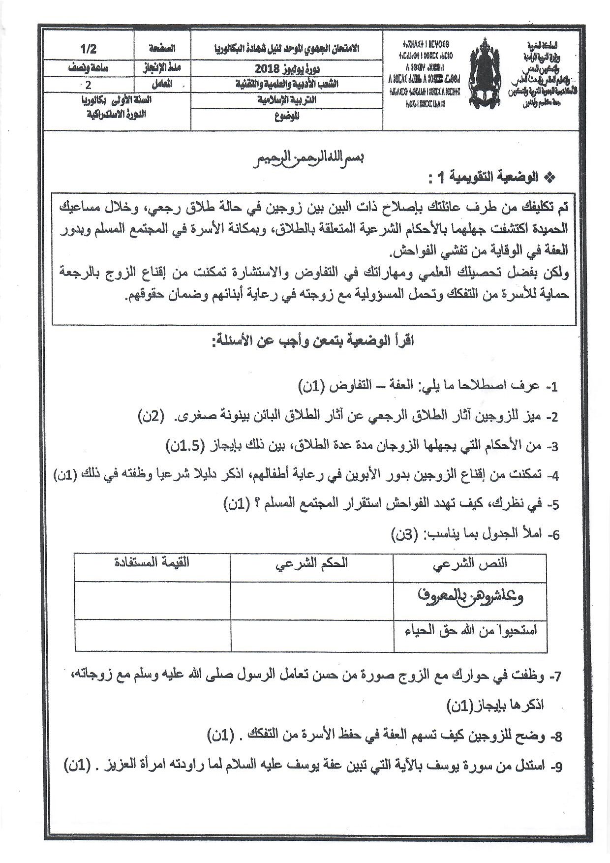 الامتحان الجهوي في التربية الإسلامية (د. الإستدراكية) - كلميم واد نون 2018 - الموضوع