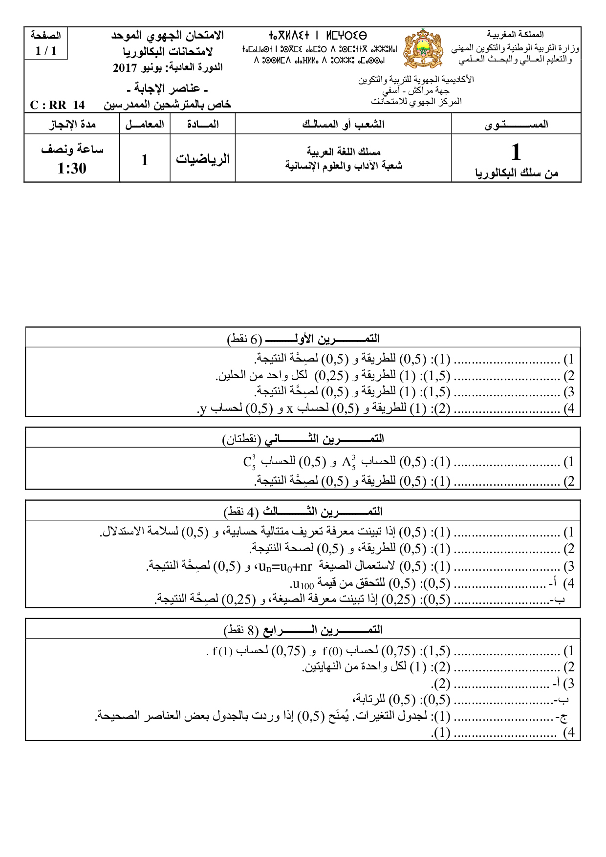 الامتحان الجهوي في الرياضيات (د. العادية) - مراكش آسفي 2017 - التصحيح