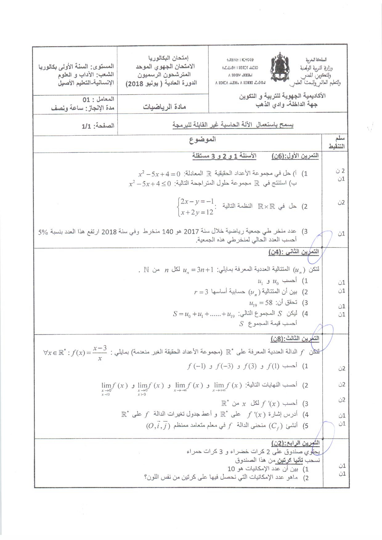 الامتحان الجهوي في الرياضيات (د. العادية) - الداخلة وادي الذهب 2018 - الموضوع