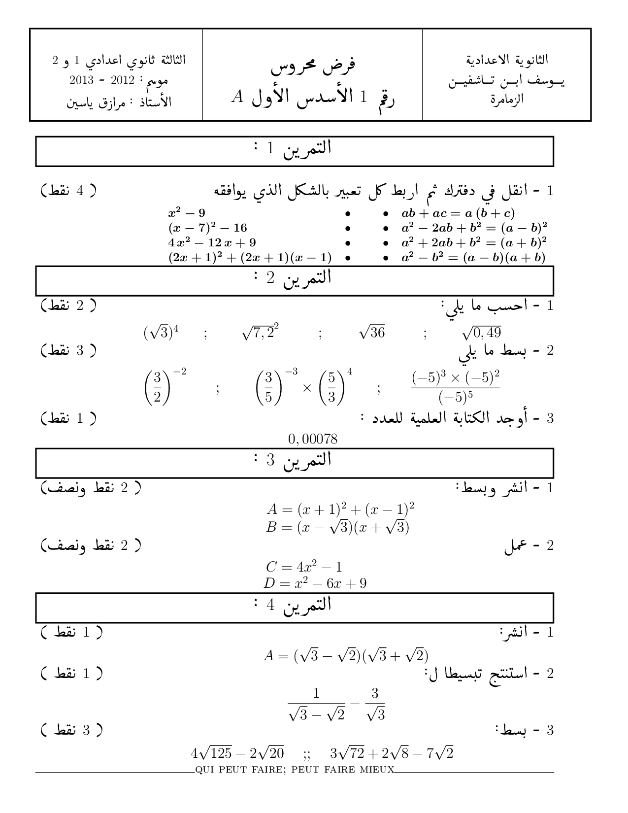 الفرض 1 نموذج 13 - الرياضيات ثالثة إعدادي الدورة الأولى