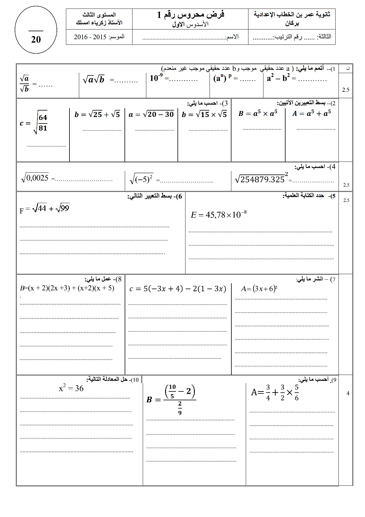الفرض 1 نموذج 15 - الرياضيات ثالثة إعدادي الدورة الأولى