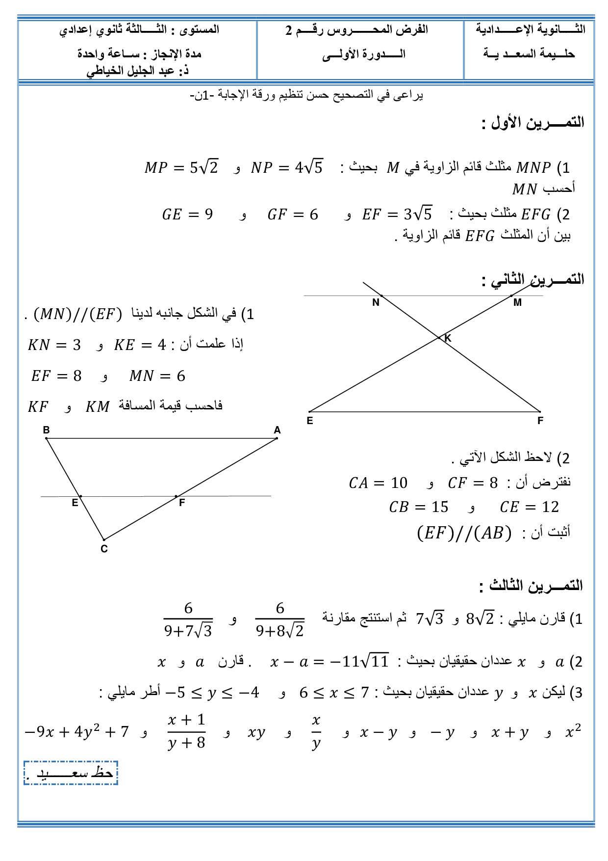 الفرض 2 نموذج 3 - الرياضيات ثالثة إعدادي الدورة الأولى