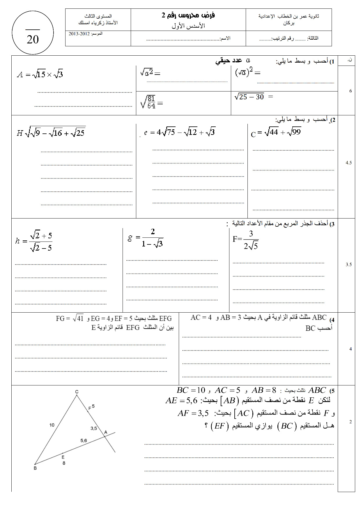 الفرض 2 نموذج 15 - الرياضيات ثالثة إعدادي الدورة الأولى