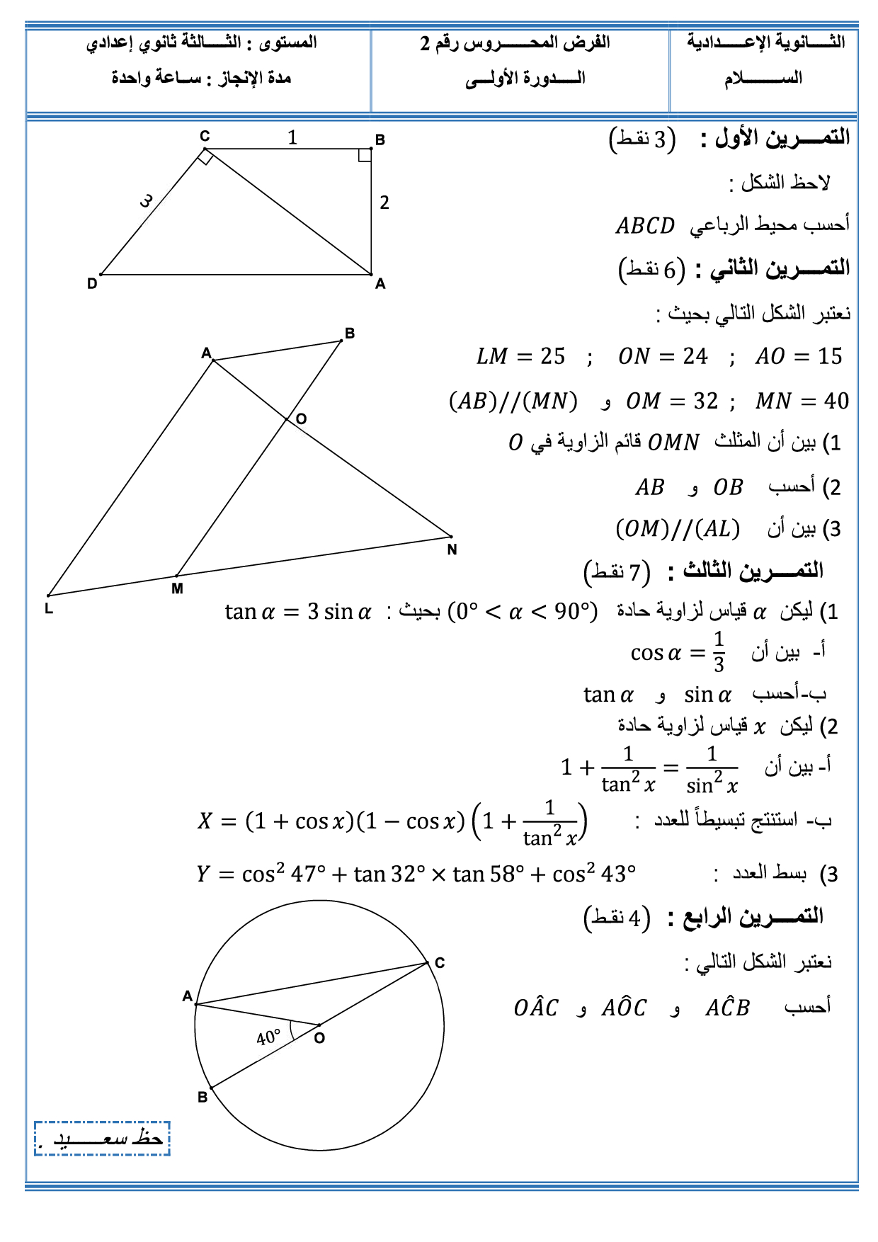 الفرض 3 نموذج 5 - الرياضيات ثالثة إعدادي الدورة الأولى