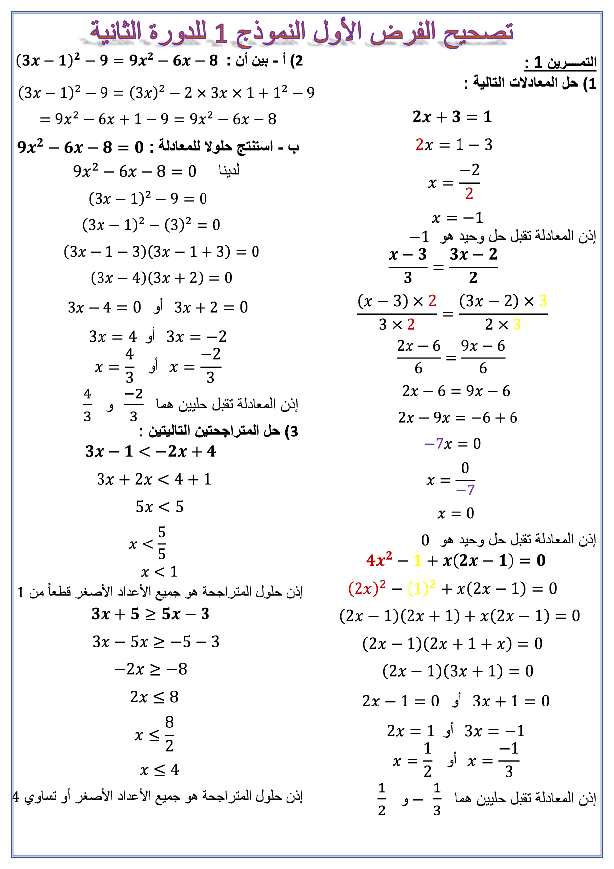 الفرض 1 نموذج 6 - الرياضيات ثالثة إعدادي الدورة الثانية (التصحيح)