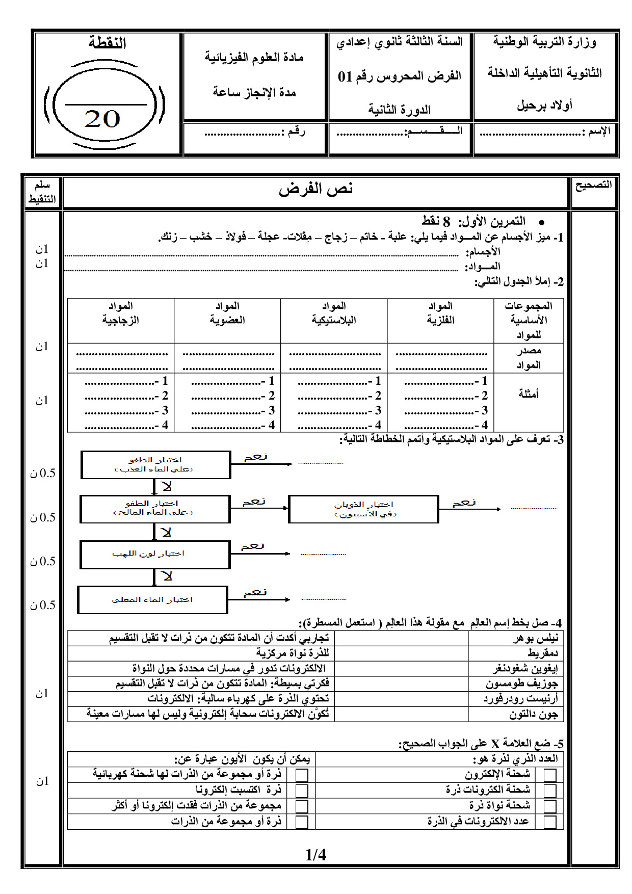 الفرض 1 نموذج 15 - الفيزياء والكيمياء ثالثة إعدادي الدورة الثانية