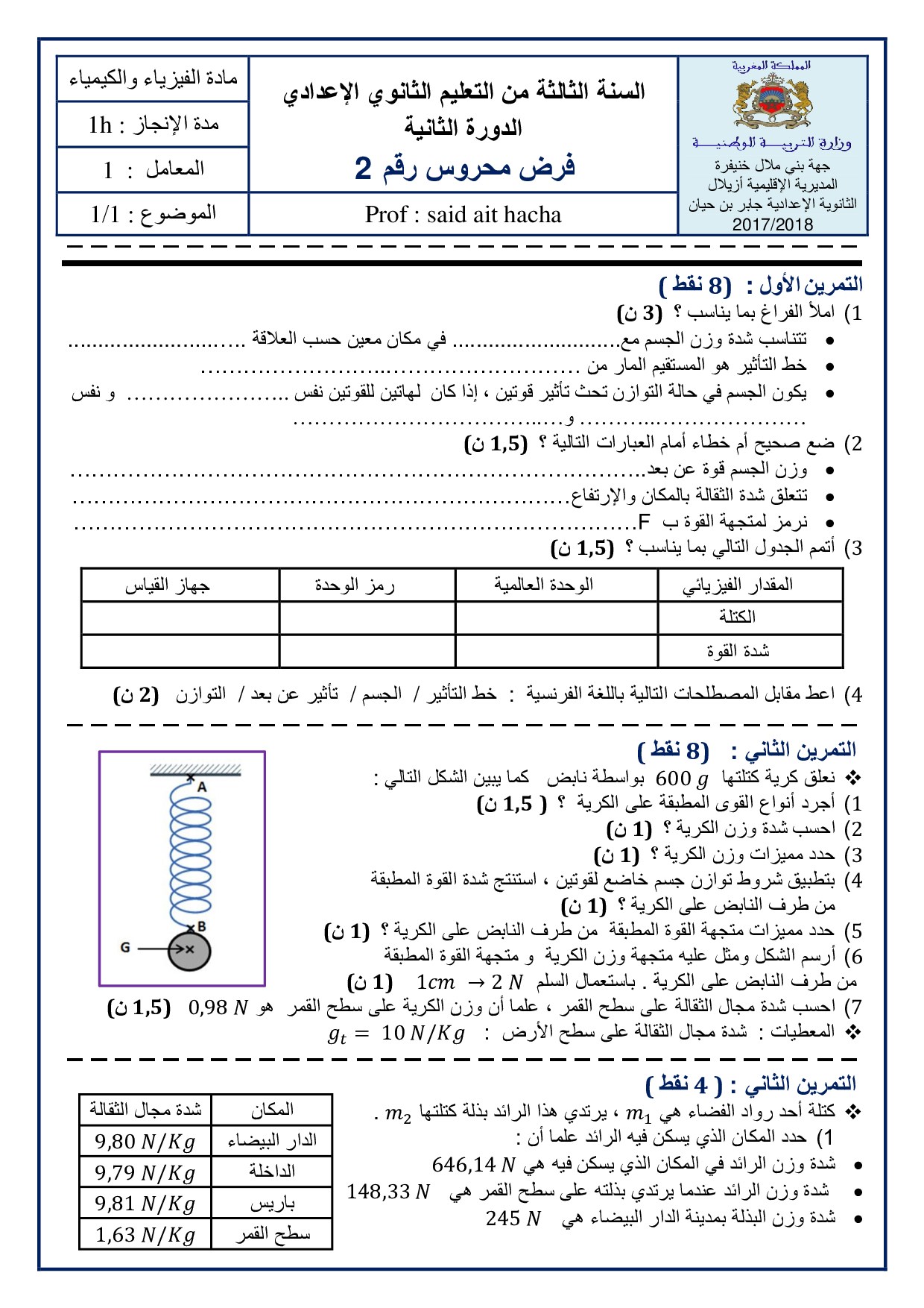 الفرض 2 نموذج 9 - الفيزياء والكيمياء ثالثة إعدادي الدورة الثانية