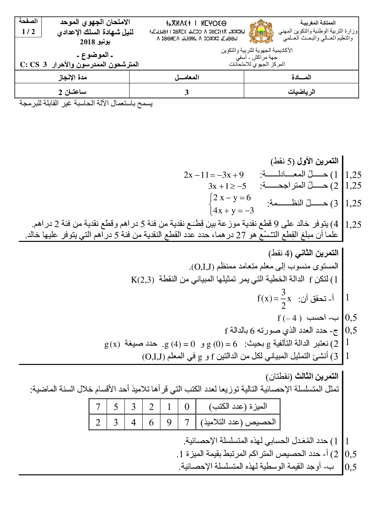 الامتحان الجهوي للثالثة إعدادي (الرياضيات) - مراكش آسفي 2018 - الموضوع