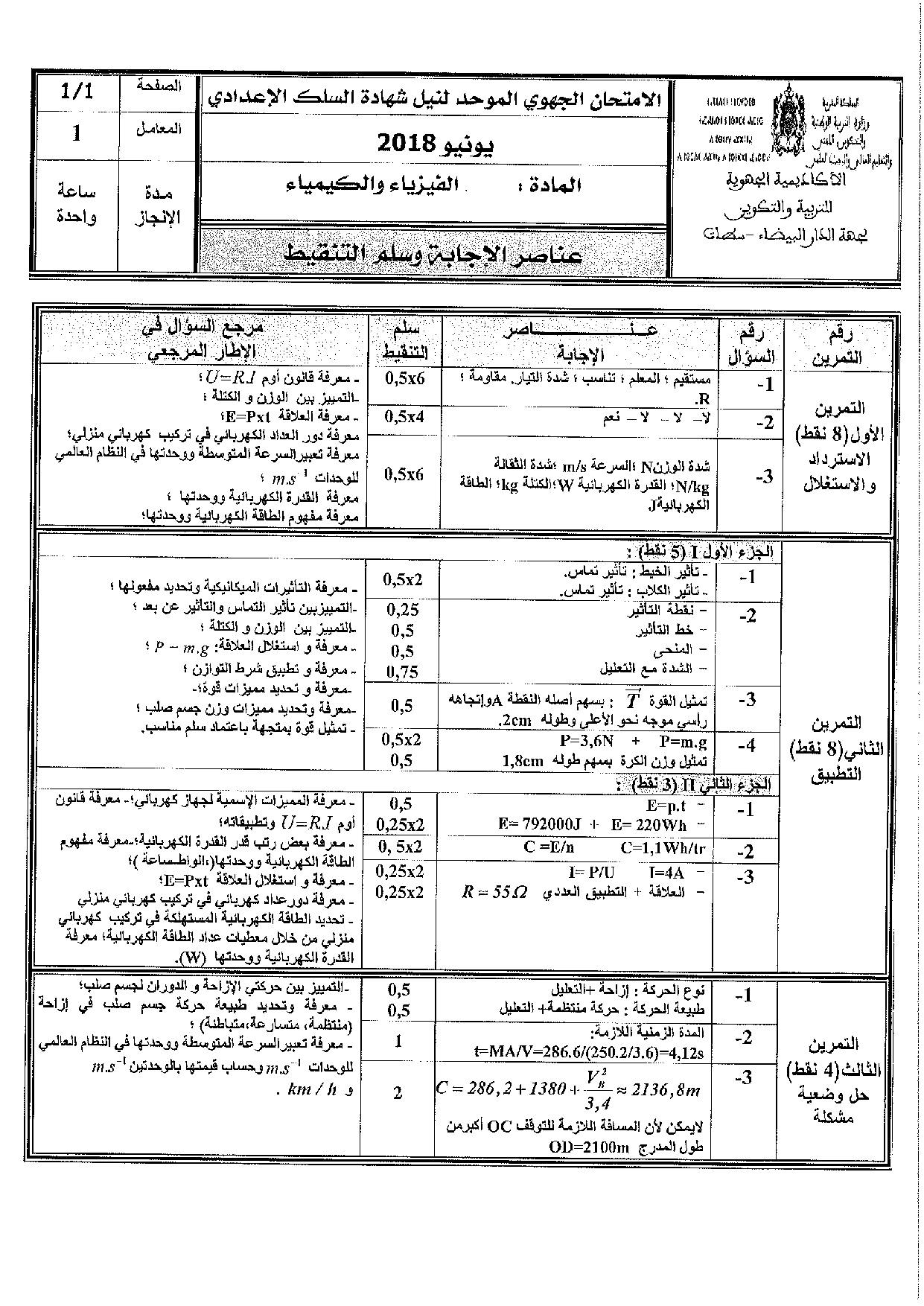 الامتحان الجهوي للثالثة إعدادي (الفيزياء والكيمياء) - الدار البيضاء سطات 2018 - التصحيح