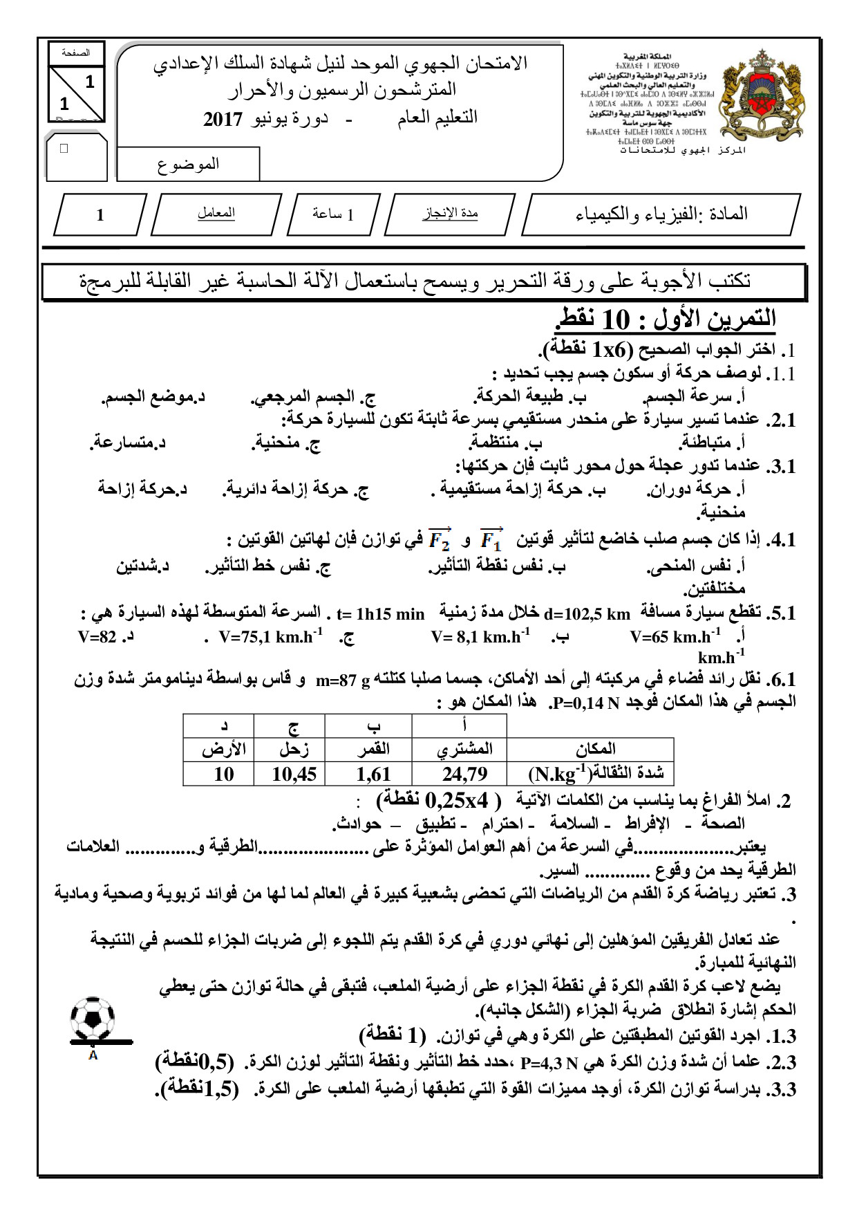 الامتحان الجهوي للثالثة إعدادي (الفيزياء والكيمياء) - سوس ماسة 2017 - الموضوع