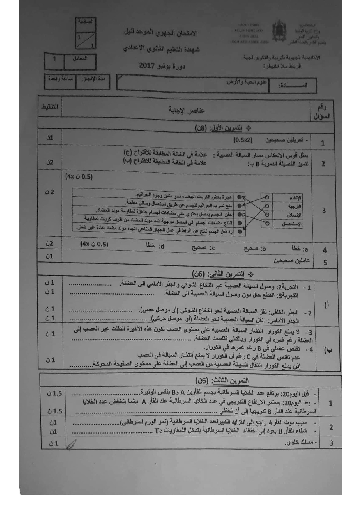 الامتحان الجهوي للثالثة إعدادي (علوم الحياة والأرض) - الرباط سلا القنيطرة 2017 - التصحيح