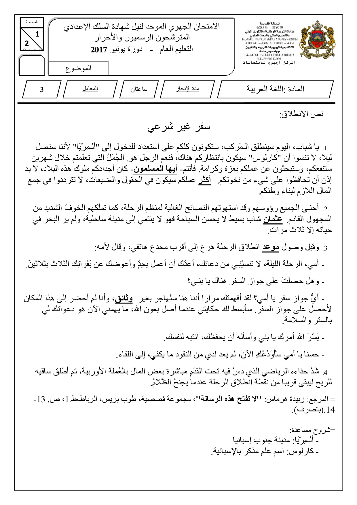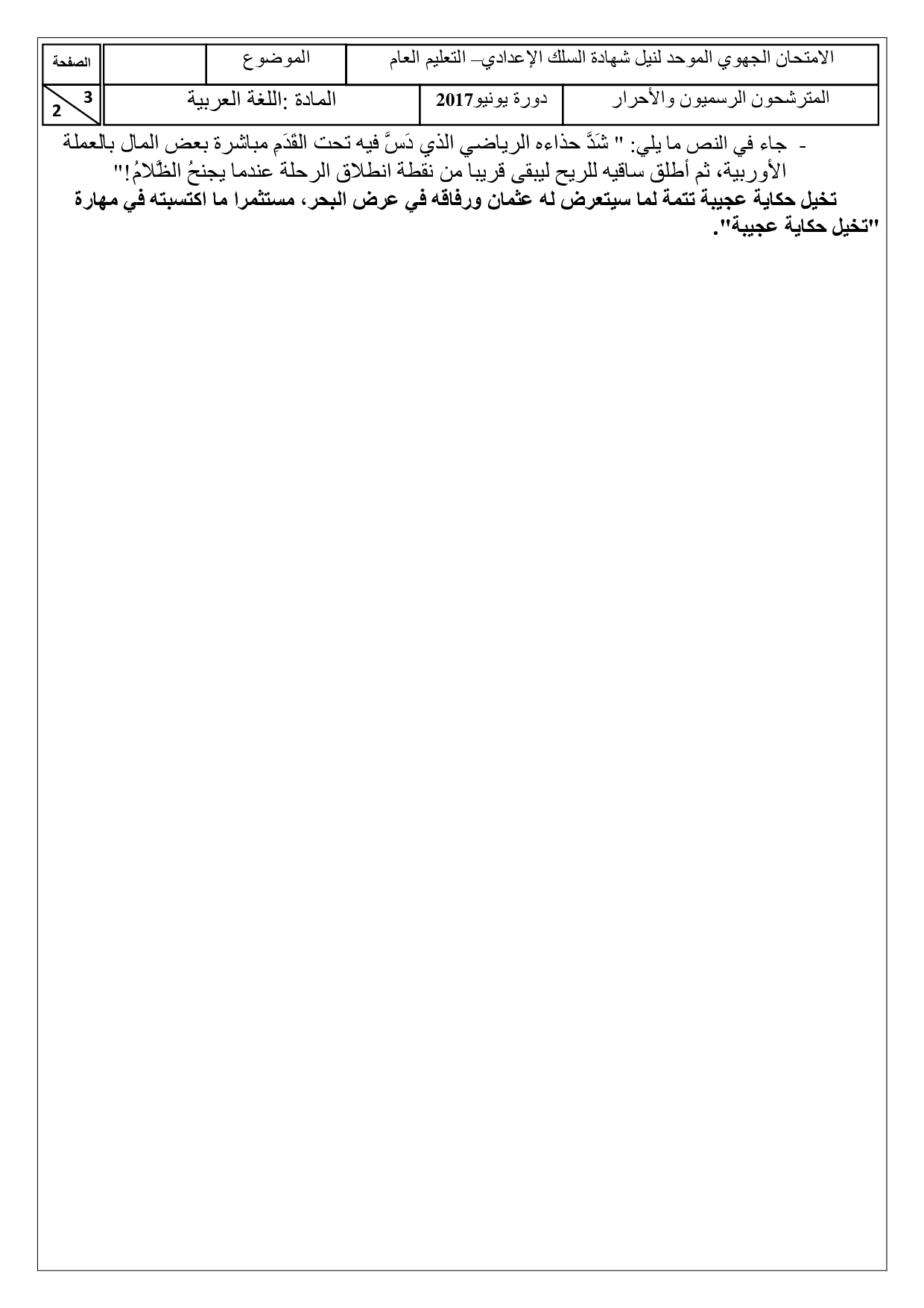 الامتحان الجهوي للثالثة إعدادي (اللغة العربية) - سوس ماسة 2017 - الموضوع