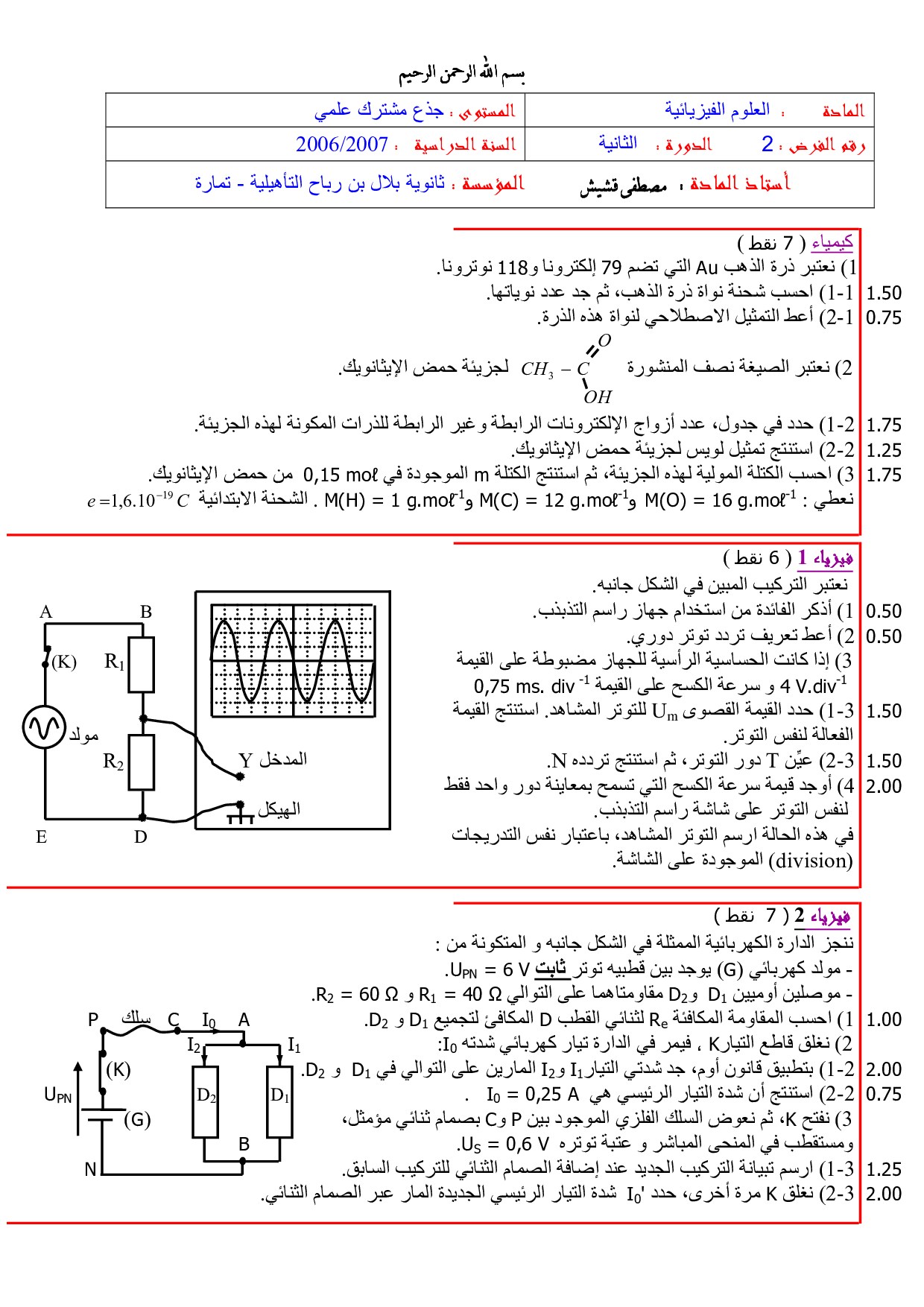 الفرض 2 نموذج 7 - الفيزياء والكيمياء جذع مشترك الدورة الثانية