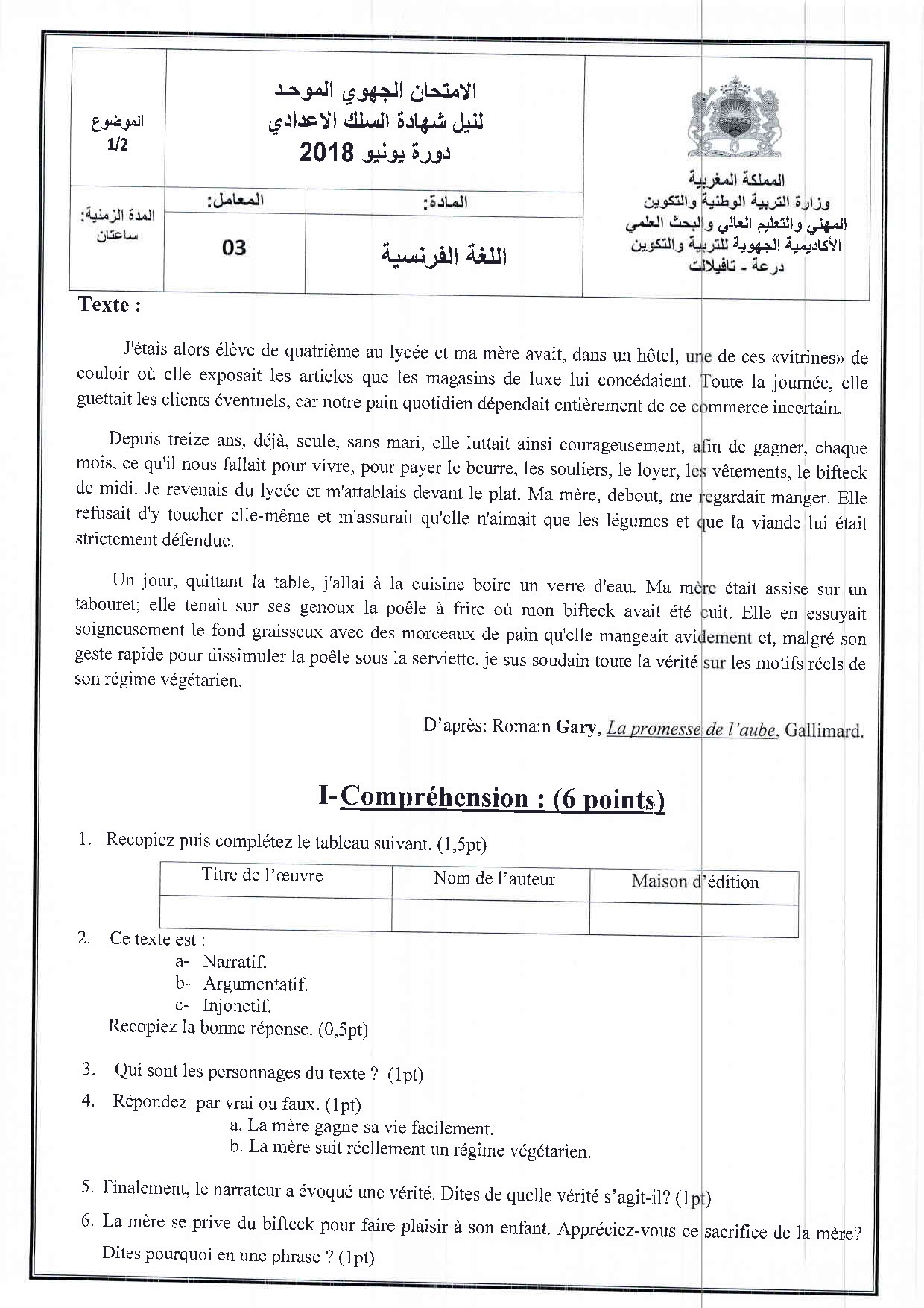 Examen régional 3AC en Français - Drâa-Tafilalet 2018 - Sujet