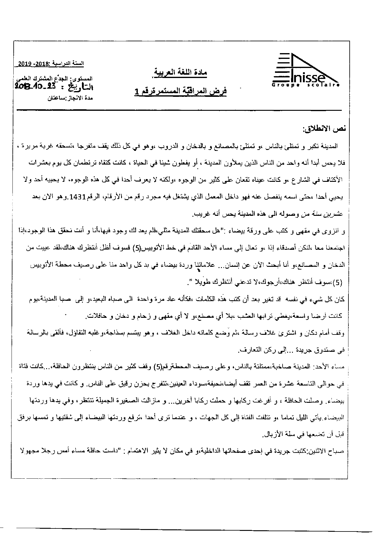 الفرض 1 نموذج 2 - اللغة العربية جذع مشترك الدورة الأولى