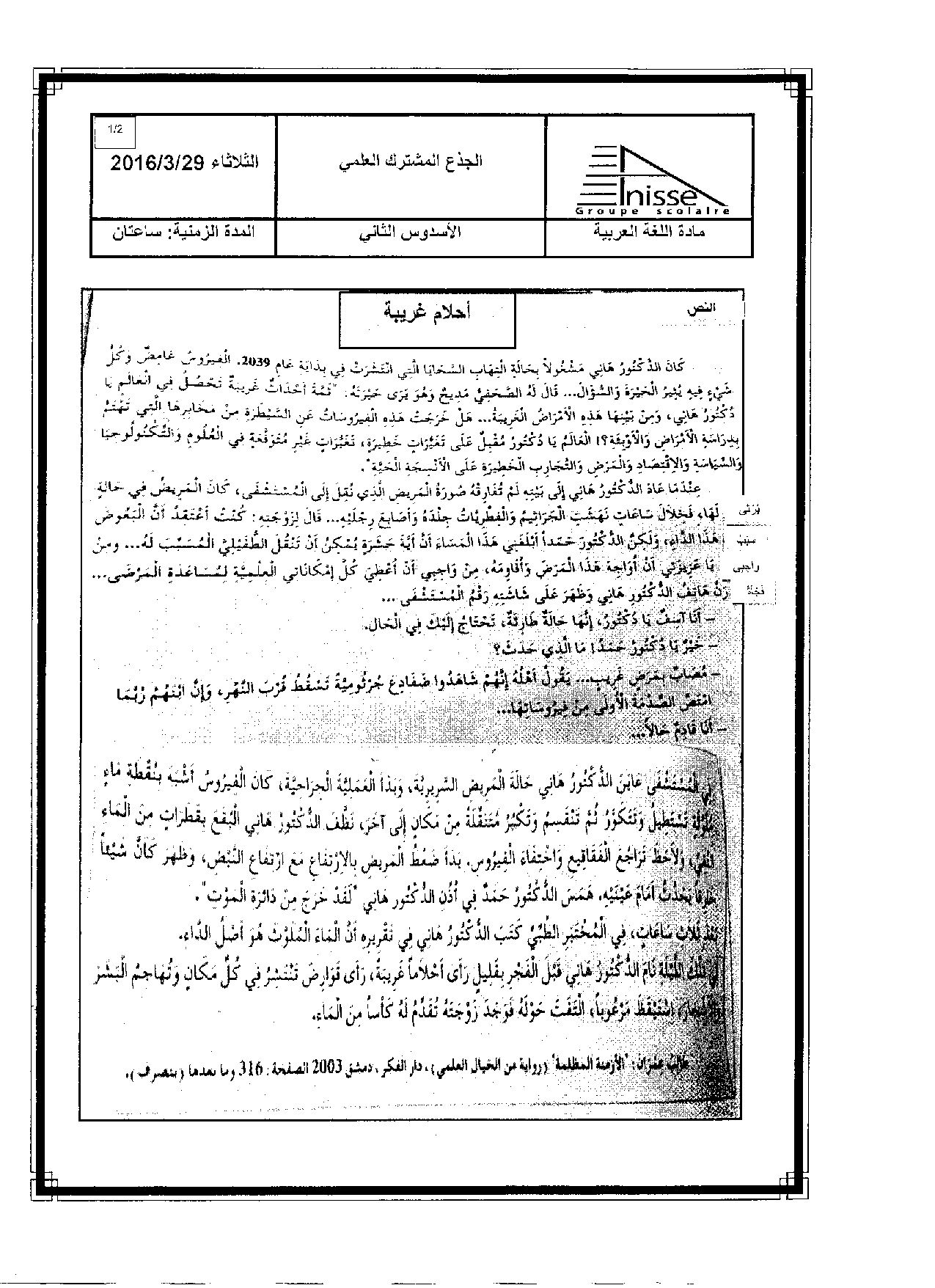 الفرض 1 نموذج 4 - اللغة العربية جذع مشترك الدورة الثانية