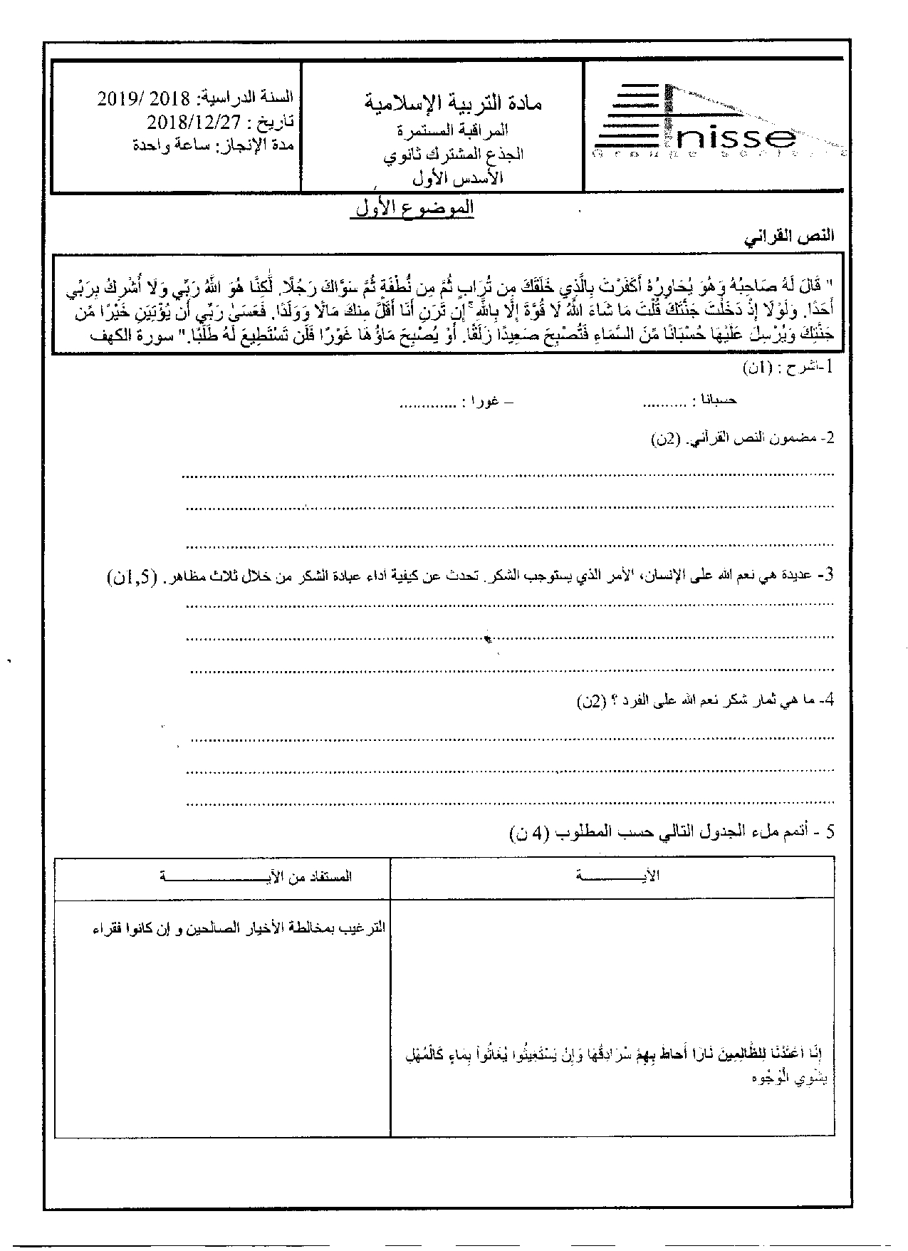 الفرض 2 نموذج 7 - التربية الإسلامية جذع مشترك الدورة الأولى