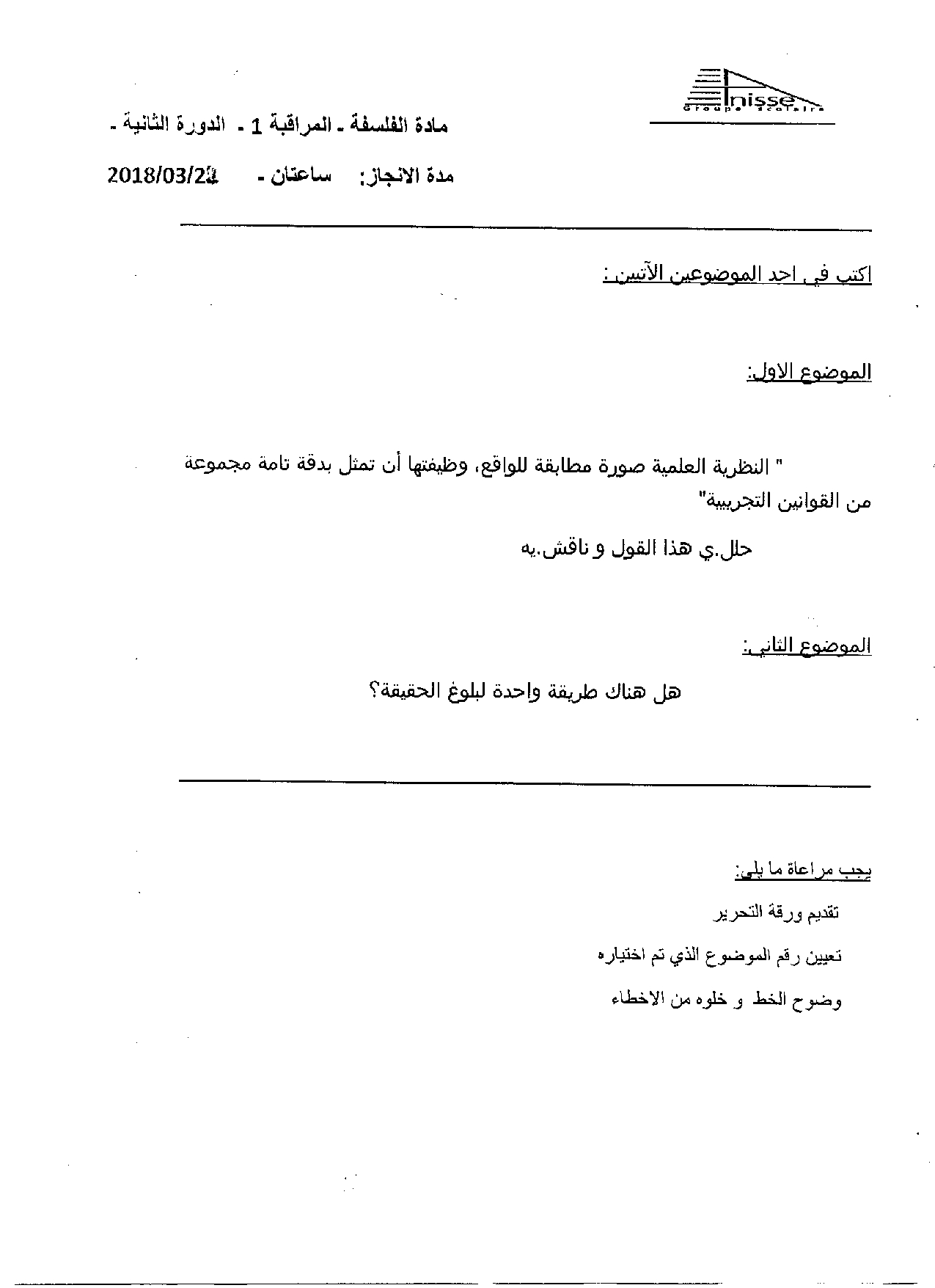 الفرض 1 نموذج 2 - الفلسفة ثانية باك علوم وتقنيات الدورة الثانية