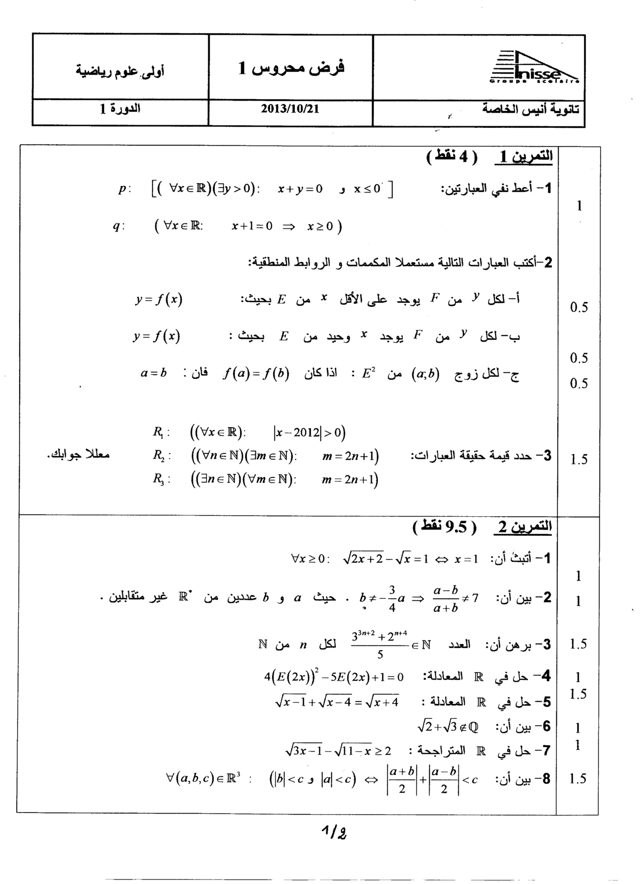 الفرض 1 نموذج 9 - الرياضيات أولى باك علوم رياضية الدورة الأولى