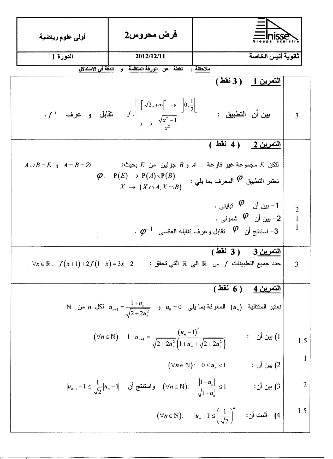 الفرض 2 نموذج 7 - الرياضيات أولى باك علوم رياضية الدورة الأولى