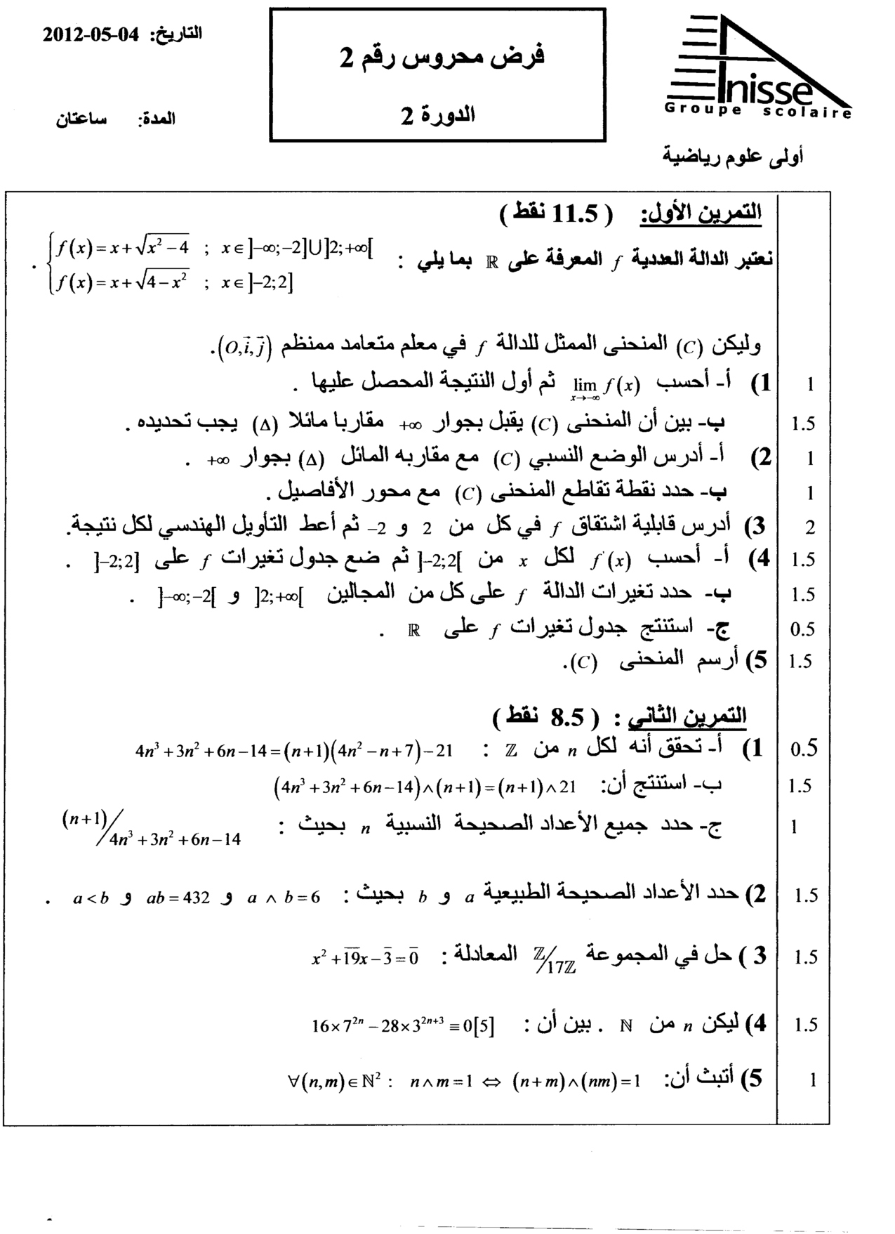 الفرض 2 نموذج 5 - الرياضيات أولى باك علوم رياضية الدورة الثانية