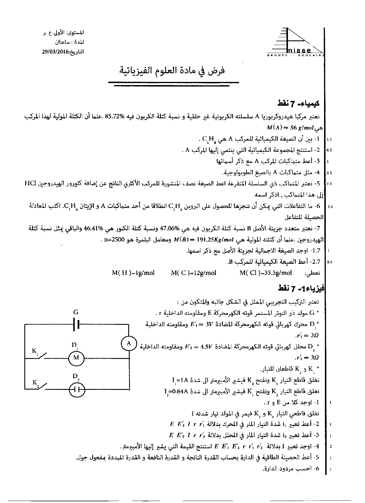 الفرض 2 نموذج 4 - الفيزياء والكيمياء أولى باك علوم رياضية الدورة الثانية