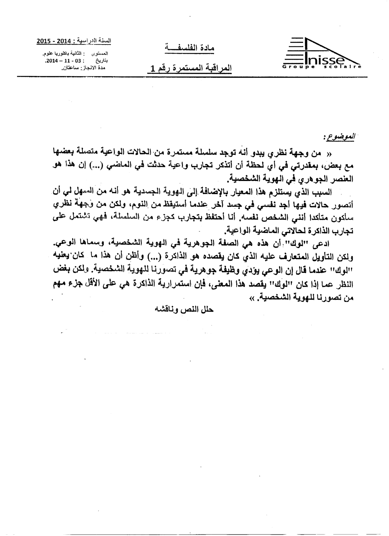 الفرض 1 نموذج 6 - الفلسفة ثانية باك علوم وتقنيات الدورة الأولى