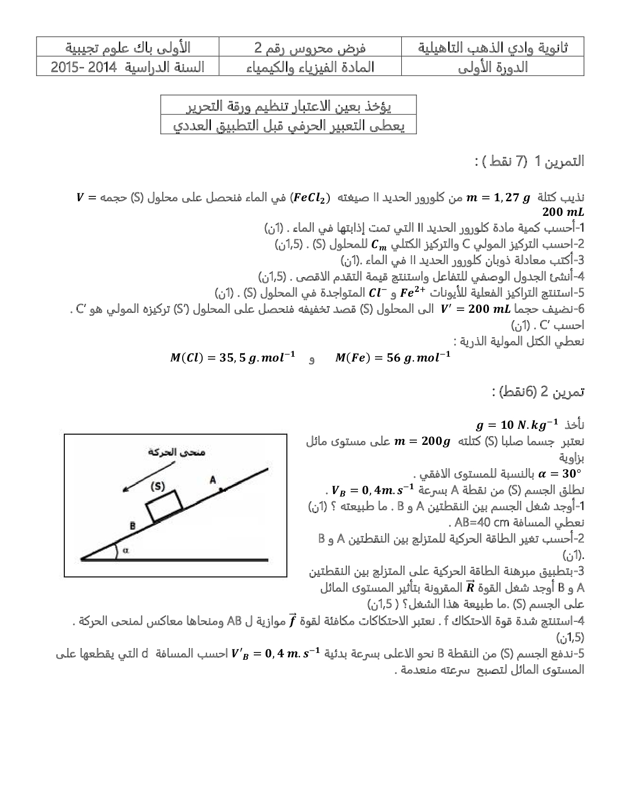 الفرض 2 نموذج 3 - الفيزياء والكيمياء أولى باك علوم تجريبية الدورة الأولى
