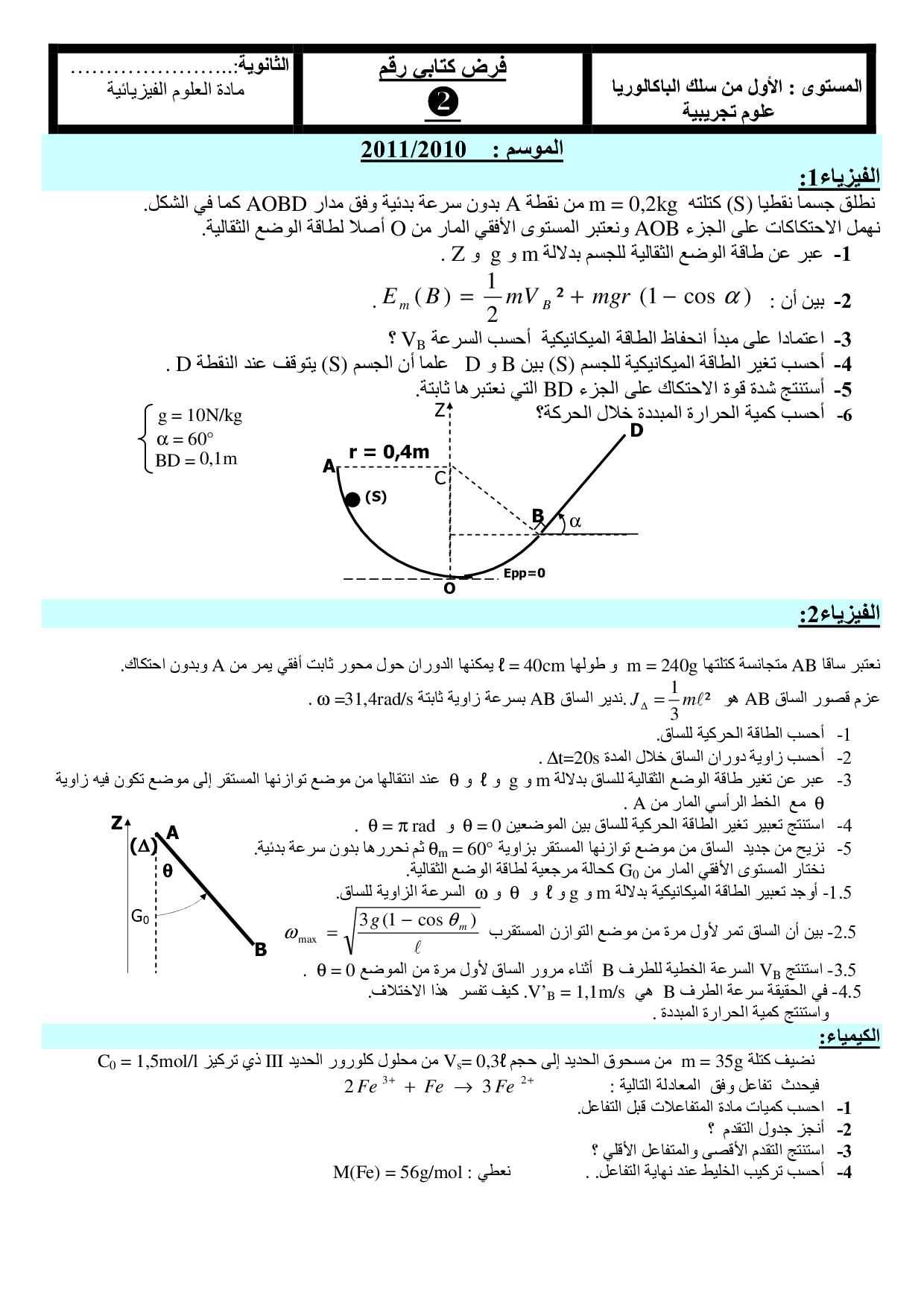 الفرض 2 نموذج 17 - الفيزياء والكيمياء أولى باك علوم تجريبية الدورة الأولى