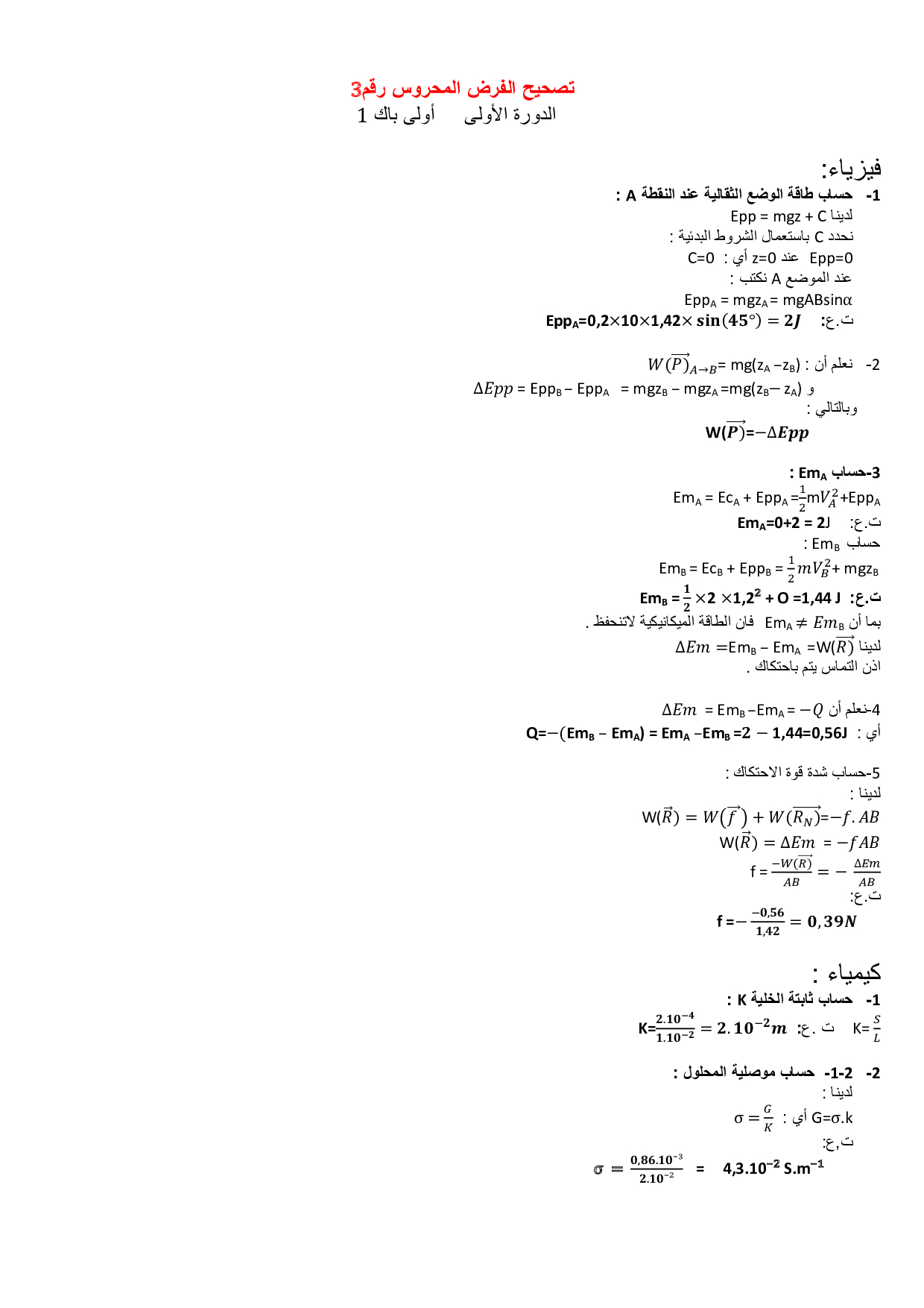 الفرض 3 نموذج 3 - الفيزياء والكيمياء أولى باك علوم تجريبية الدورة الأولى (التصحيح)