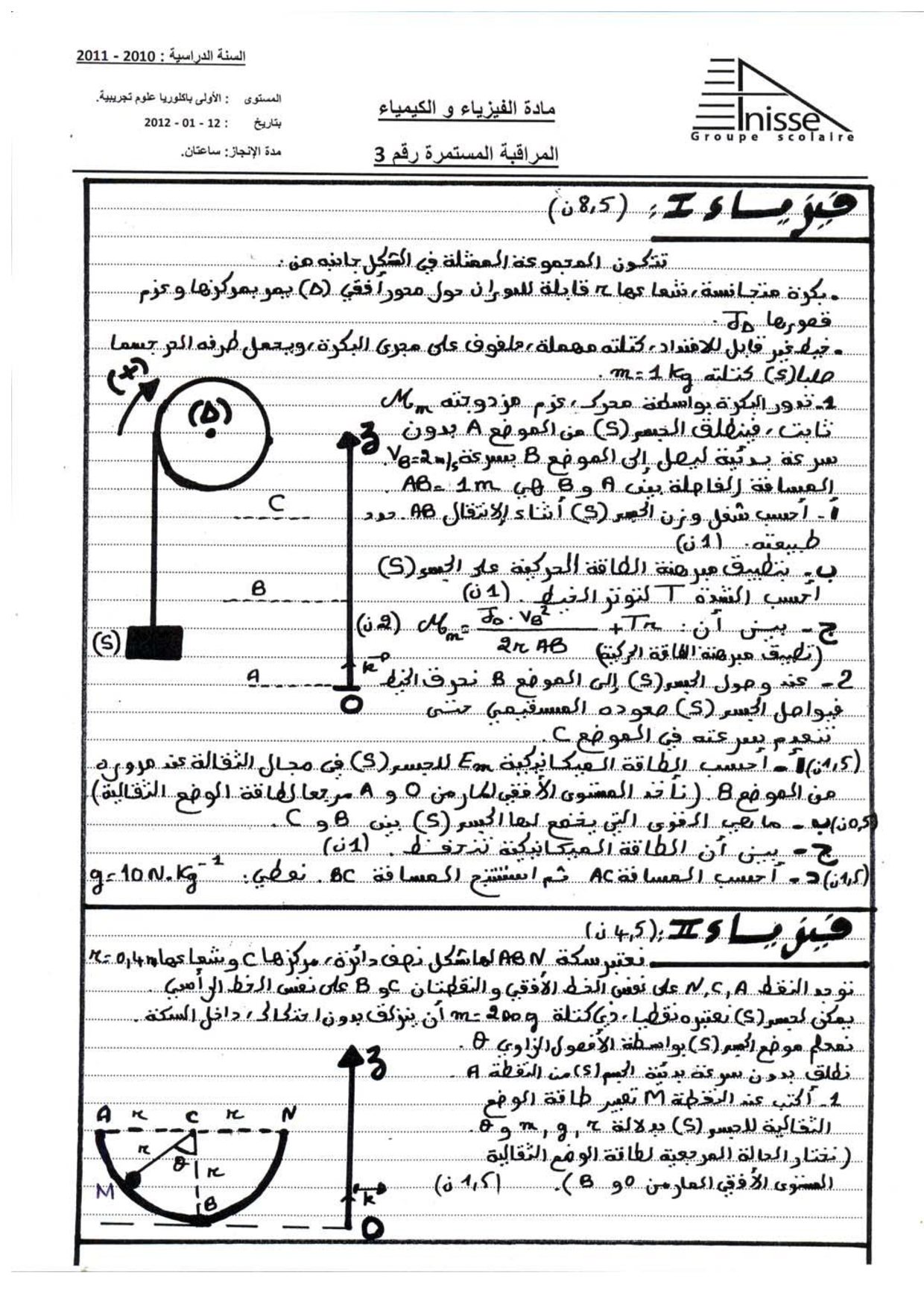 الفرض 3 نموذج 16 - الفيزياء والكيمياء أولى باك علوم تجريبية الدورة الأولى