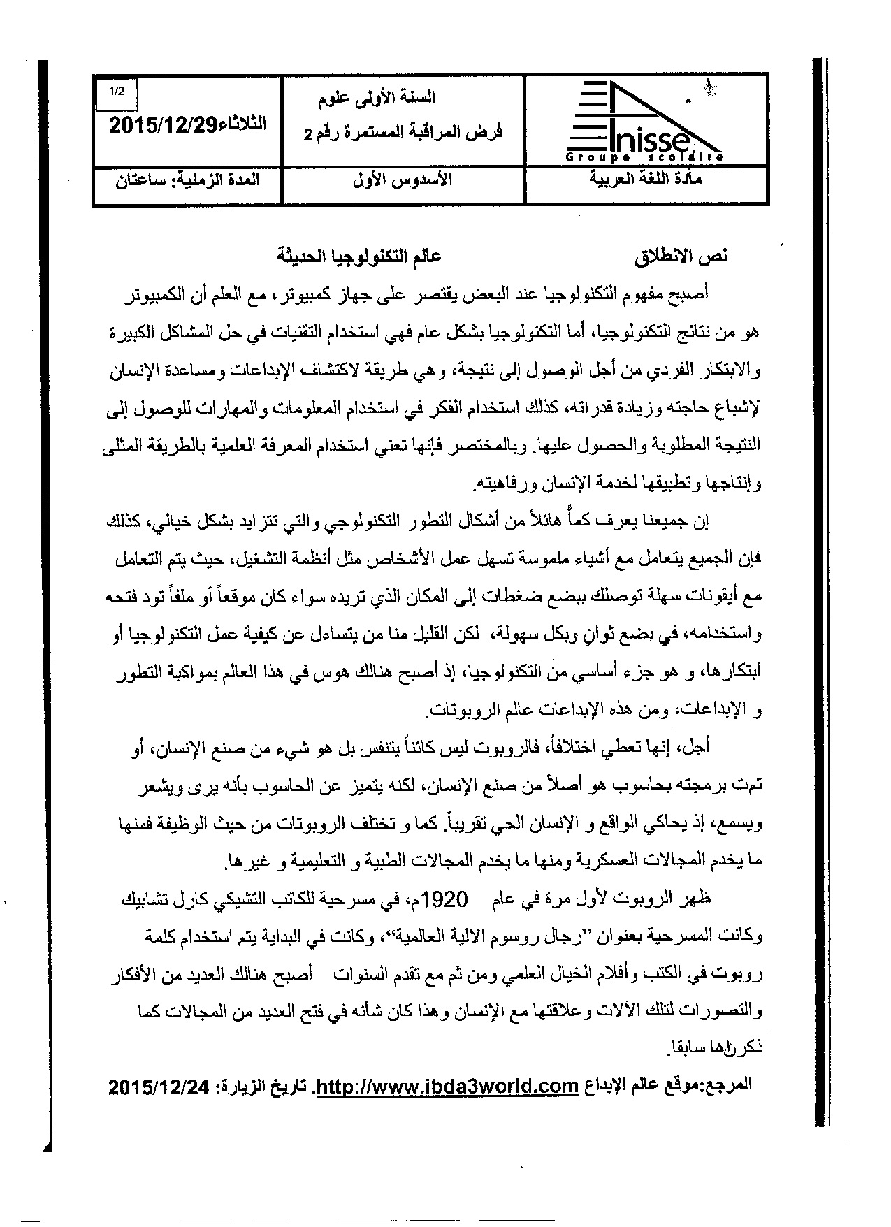 الفرض 2 نموذج 4 - اللغة العربية أولى باك الدورة الأولى