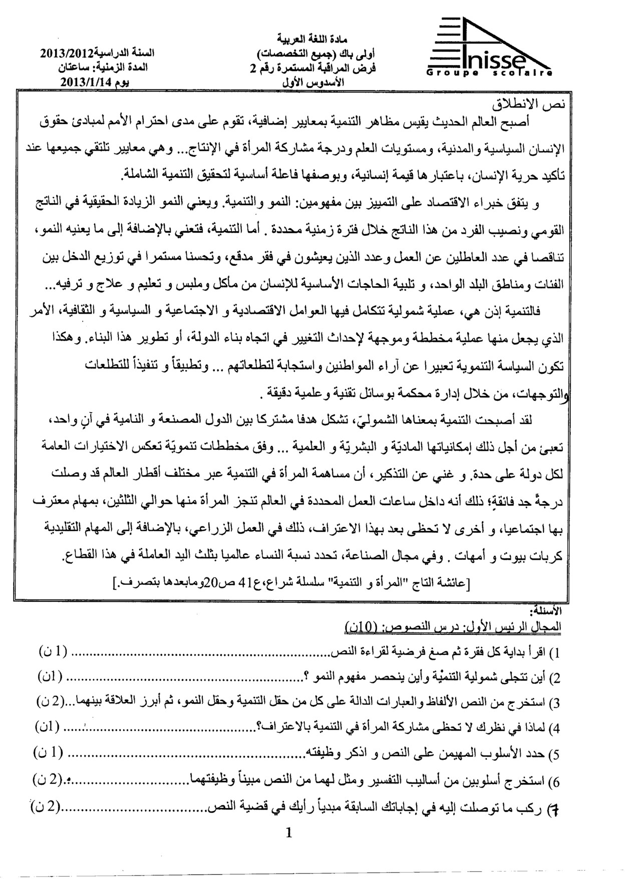 الفرض 2 نموذج 6 - اللغة العربية أولى باك الدورة الأولى